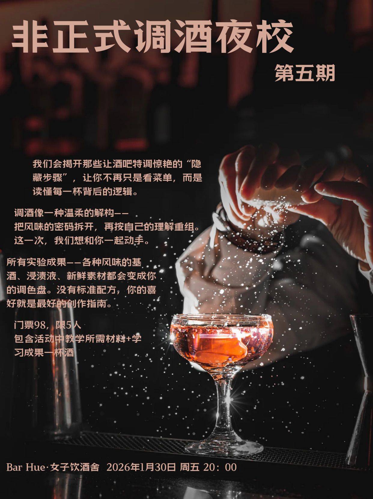 #全女活动  # #调酒夜校  #调酒课程  #成都活动  #艺术灵感  #酒吧实验  #微醺时刻  #亲手调酒  #夜晚灵感