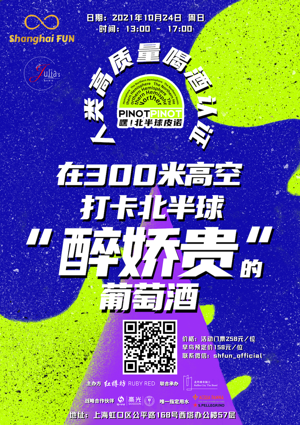 这是一场大型的黑皮诺盛会,我们搜罗世界上醉优秀的黑皮诺葡萄酒,分享给来自各地的酒友们来一起品鉴。 自2018年至今,已经举办了两届啦!主题从“新西兰DING尖黑皮诺”到“勃艮第与新西兰黑皮诺”,黑皮诺还是黑皮诺,会场状况仍旧是抵挡不住的火热(让我们倒酒倒到手软)。 喝黑皮诺要趁凉。这个被誉为“醉娇贵”的葡萄品种,热了不行冷了不行,只有在适宜的凉爽生长环境下,才能绽放醉精致优雅的风格。 喝黑皮诺要趁早。前几年还是酒圈小众的时候,价格已然是酒中翘楚的存在了,这两年随着知名度的增加,价格更是噌噌飞涨。 打开“世界醉贵葡萄酒榜单”,黑皮诺总是长年霸占榜首的存在。 大酒我们远远观望就好,不过寻常市面上的黑皮诺葡萄酒,就拿大家公认的勃艮第来说,基本也是 2-300 的价格区间内,才能比较放心的入手。 这么合计下来,我们这场集齐冷凉北半球 6 个国家,100 多款优质佳酿,门票(竟然)只要100 多的“高质量黑皮诺局”,不来还是会有(非)些(常)遗憾的吧! 今年,在一众“黑皮诺粉丝们”的声势号召下,我们决定继续为大家呈上这一场黑皮诺盛典! 北外滩来福士空中花园,300 米高空,横扫北半球 6 个国家的醉娇贵葡萄酒,等你来打卡! 6 个国家,60 多个葡萄酒产区,哪里才是你的心中最爱? 北半球高质量喝酒者,等你来认证! PINOT PINOT 嘿!北半球皮诺 生在北半球的葡萄酒玩家,怎么能不了解北半球的黑皮诺? 这一次,我们汇集了来自北半球6个国家,60多个葡萄酒产区的黑皮诺,总价值超45,000元的黑皮诺葡萄酒。总有一款深得你心! 中国 Tiansai Vineyards 天塞酒庄 Canaan Winery 迦南酒业 Silver Heights Vineyard 银色高地酒庄 Chateau Chanson 尚颂堡酒庄 法国 Chateau de Laborde 岚柏古堡 Domaine Jacques Prieur 雅克普里耶庄园 Domaine Olivier Leflaive 乐飞庄园 Domaine Fanny Sabre 凡人诗庄园 Domaine Laurent Pillot 彼洛特庄园 Domaine Vincent Girardin 乔丹庄园 Les Parcellaires de Saulx 春索酒庄 Domaine des Monts Luisants 禄仙庄园 Maison Henri Pion 亨利皮昂兄弟庄园 Champagne Delamotte 德乐梦香槟 Champagne Robert de Pampignac 罗博朋克香槟 Champagne Laherte Freres 金兰香槟 Champagne Tarlant 踏浪香槟 Domaine Maire fils 双雀庄园 Charles de Fere 迪费庄园 Maison Roche De Bellene 佰霖鸟酒庄 Les Vins Georges Duboeuf 乔治杜博夫酒庄 德国 Weingut Oliver Zeter 小熊酒庄 Weingut Fritz Haag 弗茨海格酒庄 Weingut Haart 哈特酒庄 Weingut Dreissigacker 三十亩地酒庄 Weingut Muller Kern 穆勒科恩酒庄 Weingut Burggarten 城堡花园酒庄 Weingut Albert Gessinger 盖辛格酒庄 Weingut K.F.Groebe 格悦博酒庄 Weingut Becker Landgraf 贝克澜福酒庄 Rudolf Furst Winery 鲁多王子庄园 意大利 BOTTEGA S.p.A 波特嘉酒庄 奥地利 Wohlmuth Winery 沃尔夫酒庄 Hardegg Winery 哈尔德克伯爵酒庄 Prieler Winery 普利拉酒庄 Zillinger Winery 兹林格酒庄 美国 Joliesse Vineyards 乔利斯庄园 Copper Cane LLC Tranche Estate 旋曲庄园 还有更多酒庄加入当中 小编先保密,敬请期待! 购票链接:https://yoopay.cn/event/62205723 即可自由打卡会场上的所有试饮酒款! 现场还额外提供勃艮第名家之作和稀有配额酒的杯卖,以远低于餐厅里售卖单杯的价格就可以买到(数量有限,售完即止!) 入场门票258元/位 早鸟预约优惠价仅158元/位 *早鸟票将于10月22日(周五)晚上11点结束 *Early Bird ends at 11pm, Oct.22 门票包含我们精心为大家准备的 “嘿!北半球皮诺 专属礼袋” 价值98元 嘿!北半球皮诺 X 品酒杯 价值98元【老虎脚爪】 嘿!北半球皮诺 X 酒杯袋 价值89元【老虎脚爪】 嘿!北半球皮诺 X 帆布袋 价值59元【老虎脚爪】 嘿!北半球皮诺 X 酒刀 价值20元【老虎脚爪】 嘿!北半球皮诺 X 倒酒薄片(纪念装) 价值30元【老虎脚爪】 嘿!北半球皮诺 X 纪念徽章 更多优惠福利 *进场即有机会参与大抽奖! 总价值超过5000元的精美礼品等你来拿。 *互动娱乐小游戏,赢丰富奖品。 *仅限当天选购酒款的大额优惠。 活动场地 北外滩来福士 活动场地点于北外滩来福士300米高空的空中花园,遥望魔都标配四件套,享一杯午后黑皮诺! 活动详情 日期:2021年10月24日(周日) 时间:13:00 - 17:00 价格:活动门票258元/位,早鸟预定价158元/位 地址:上海虹口区公平路168号,西塔办公楼57层 购票链接:https://yoopay.cn/event/62205723 *您会在活动前3天左右收到提示短信,内含“入场二维码”,扫码入场,一人一码,请务必注意查收 *当日您可以在活动中任意时间,凭二维码入场签到 签到须知 *签到地点 北外滩来福士西塔办公楼1楼。 *签到完成后,将由专人指引乘坐VIP电梯直达57层会场。 *电子票券验票 请于签到处,出示电子票券二维码,将由工作人员为你做扫码验票。 温馨提醒 *门票一经购买,不可退款,只可自行转让。 *若有任何问题,请联系客服。微信客服号:shfun_official *为做好疫情防控,保护每一位参与者,请在签到时准备好您的实时健康绿码进行验证。