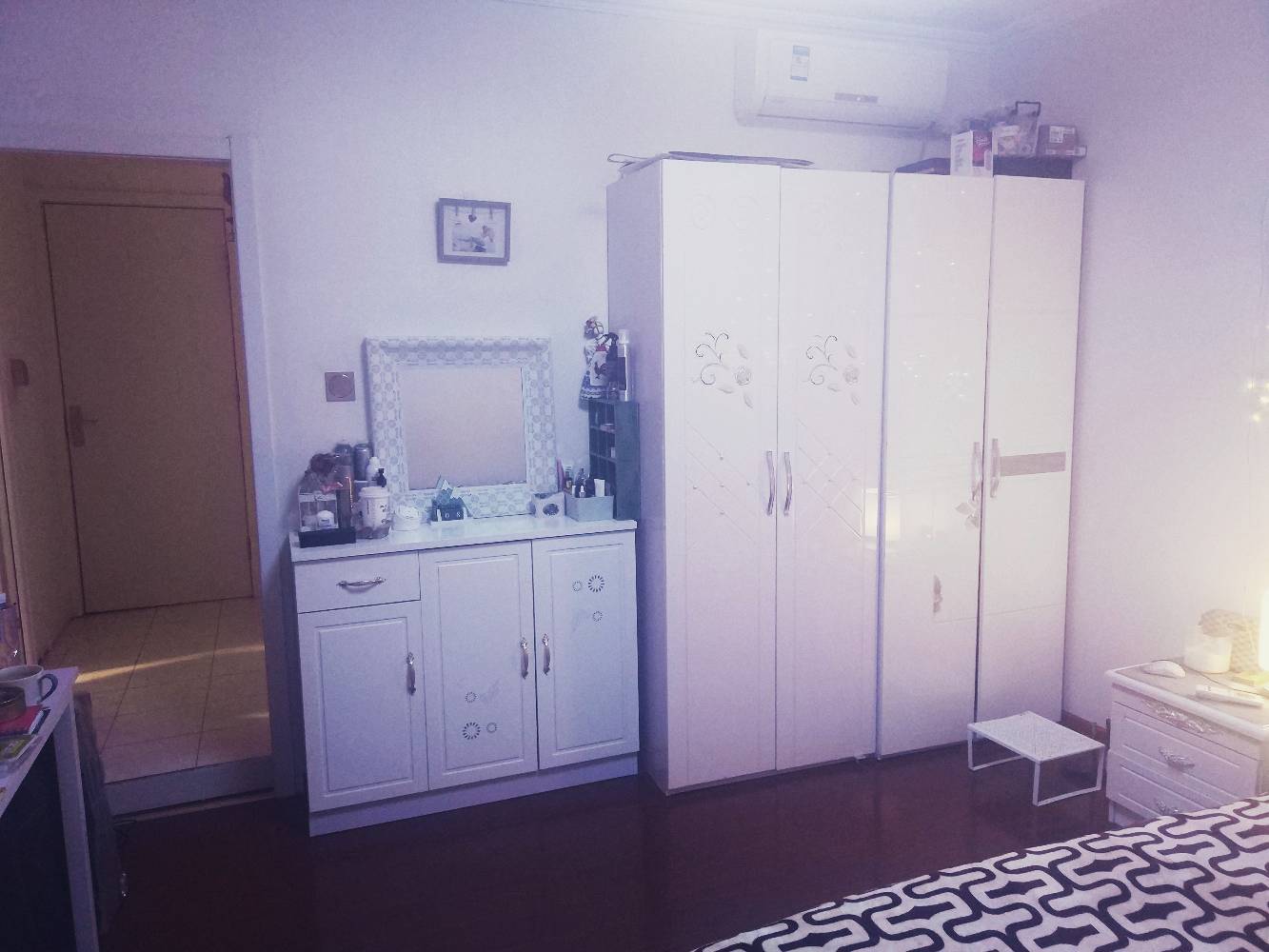 there's a corridor between bedroom and bathroom.