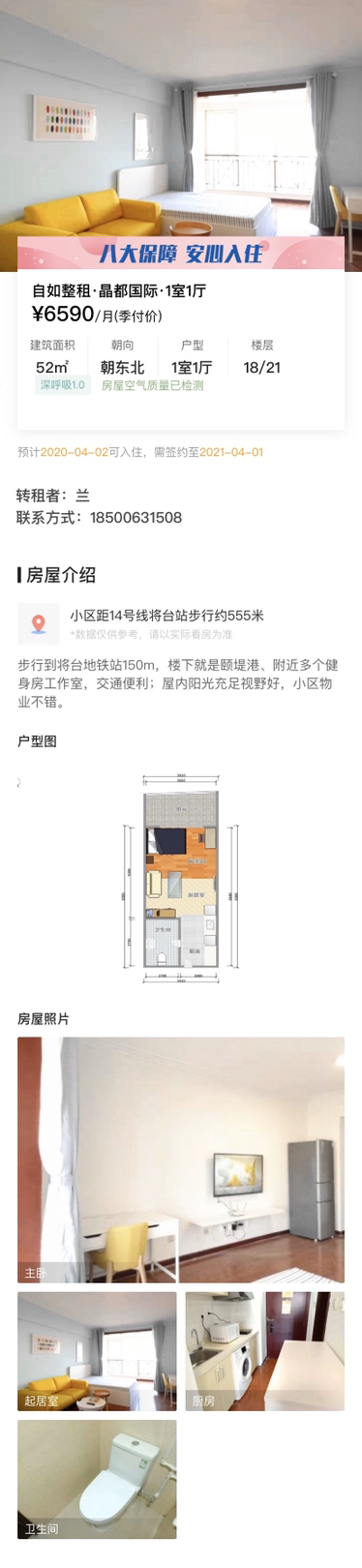 location: facing east, near Jiuxianqiao, Indigo 200meters to the subway Jiangtai station furnitures fully furnished the rent is 6590rmb/month without agency fees pm me if interested 位置: 房子是朝东北的,位于酒仙桥颐堤港旁边,离14号线将台地铁站200m。 配套: 房间内是自如标配,3开门冰箱、电视、热水器、浴缸、微波炉、联通宽带、桌椅均齐全,设施干净很新。 周边绿化不错,水果店健身房外卖很全,小区物业保利的很安全。 优势: 早上阳光超好视野开阔,楼下即是河,每月1次保洁,任何房屋问题均有管家解决。 适合情侣、单身白领居住 自如价格:6590,无中介费,合同的直接和自如签约 中介勿扰 中介勿扰 中介勿扰。