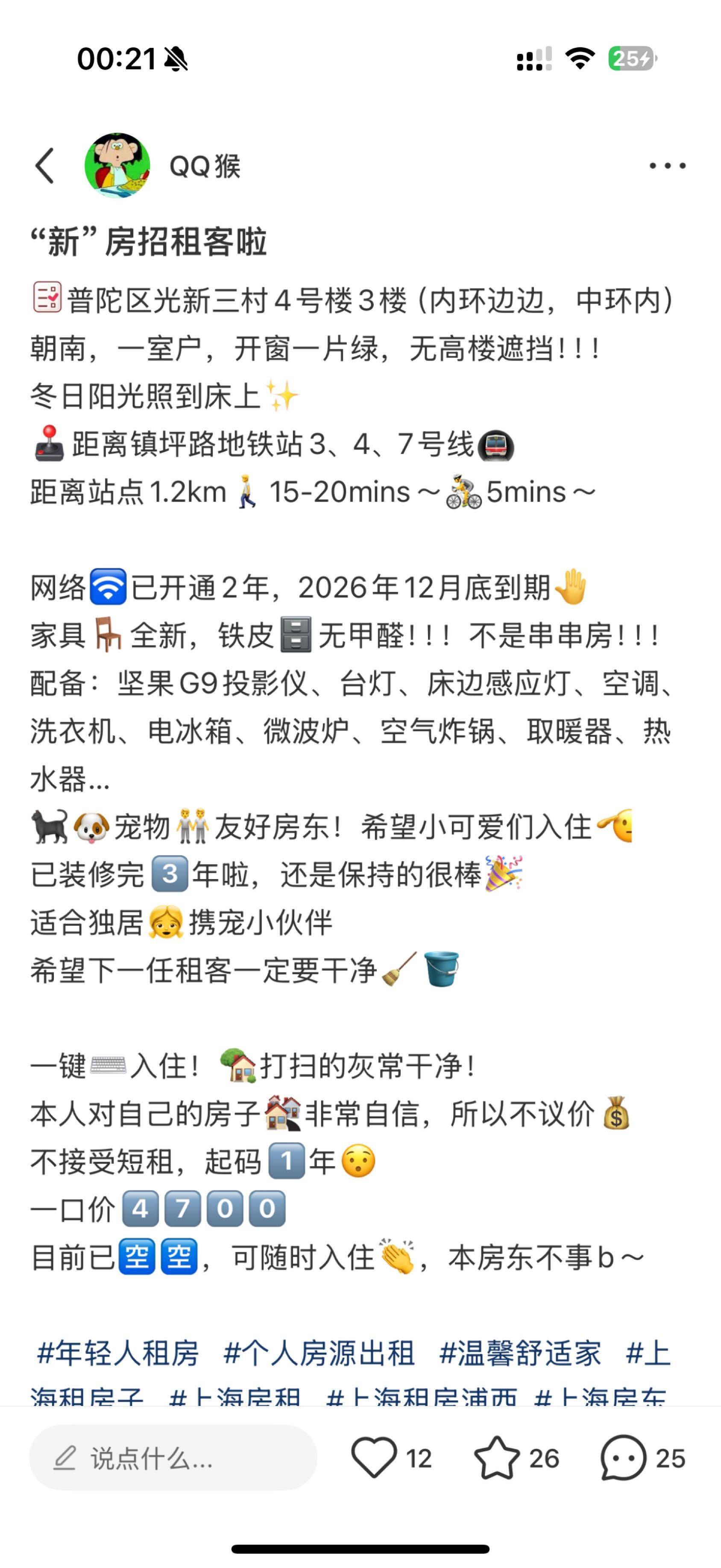 宠物友好🏡 房东一样友好! 周边超市:家乐福 还有商场🏬 很方便~~ 朝南!!阳光☀️照到床上! 一室户!!! 不是甲醛房 不是串串房 哥本人自己装修的! 新安装了2年宽带免费使用2026年12.31到期 坚果投屏、微波炉、置物架、全部配齐 佛系出租! 只接受爱干净的女孩子!