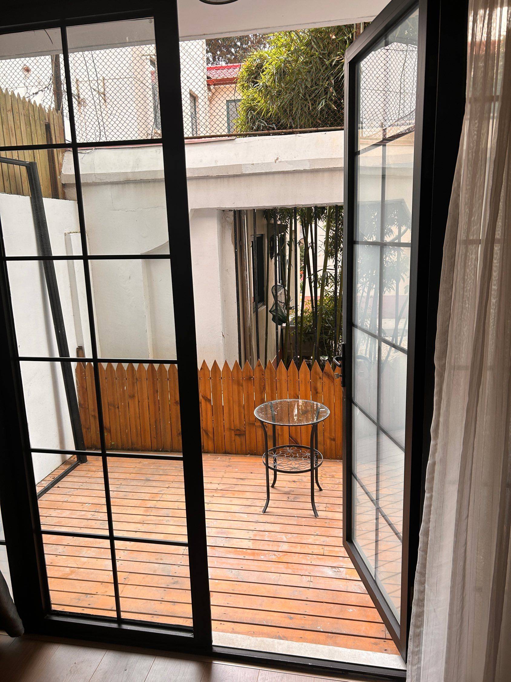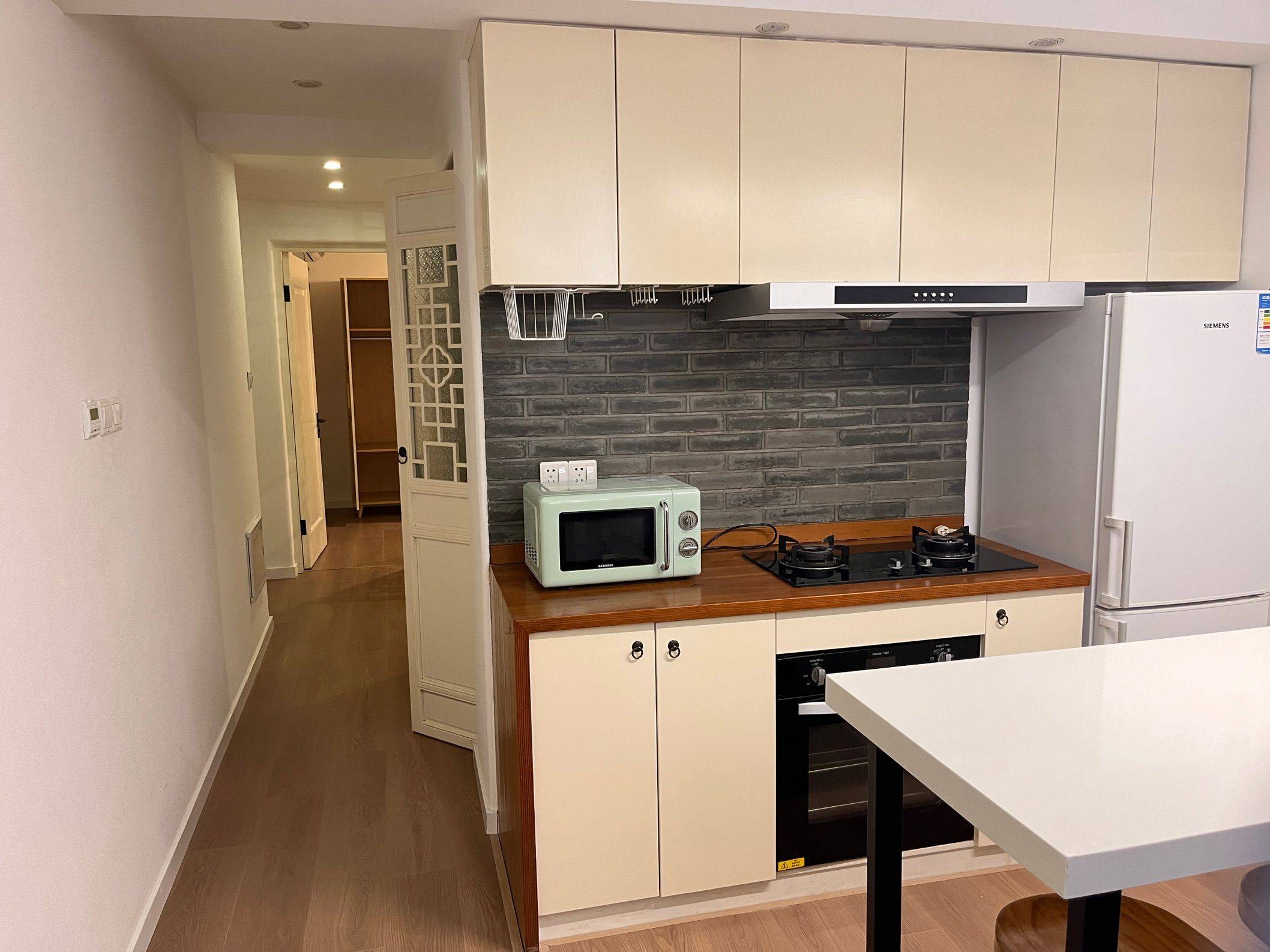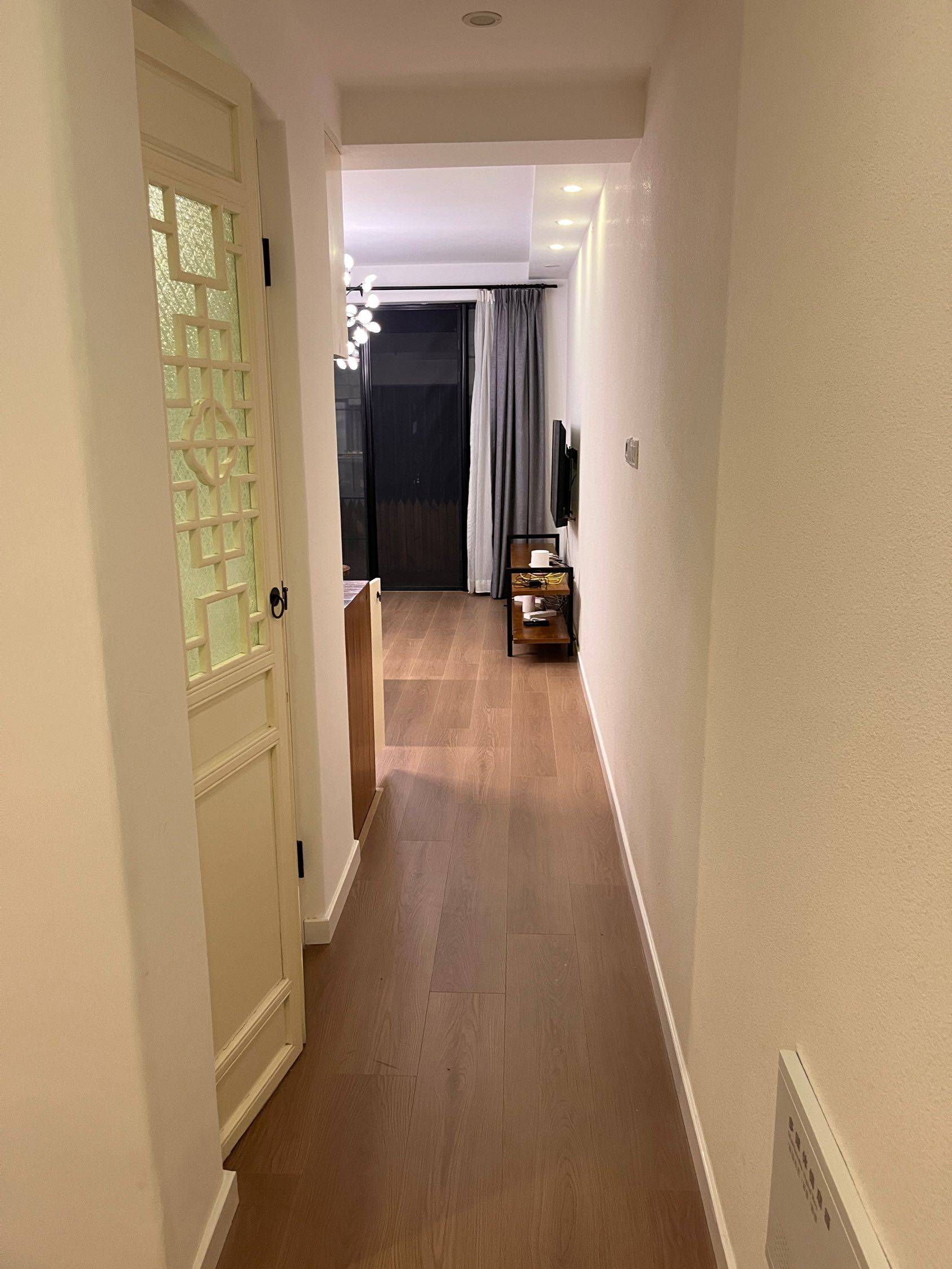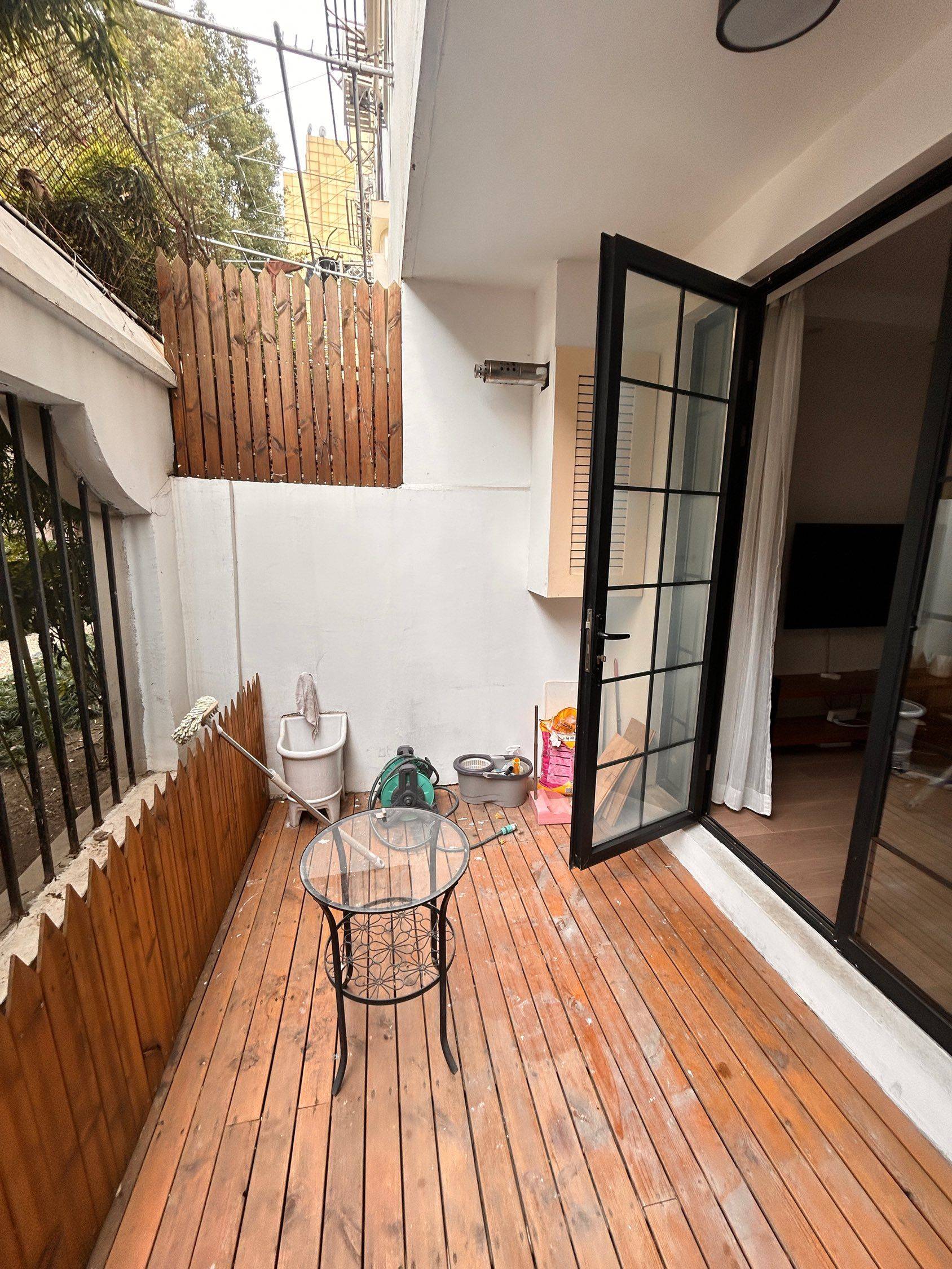 The address is located in Xujiahui, the city center. The neighborhood is bordered to the east by the One ITC Shopping Mall, to the south by Guangyuan Road and a vegetable market. Just a block away is Hengshan Road and Xujiahui Park. Nearby is the Xujiahui Station, serving subway lines 1, 9, and 11, making life and transportation extremely convenient. The house is situated deep in the alley, so it's very quiet at night. To the south is a kindergarten, so there may be some playful children's noise during the day. The neighborhood is tidy, with no parking spaces for cars but ample space for electric scooters. The interior decoration leans towards a Western lifestyle, with the master bedroom facing north and the guest bedroom facing east. The south-facing living room includes an open kitchen and a dining bar, suitable for 1-3 people. There is a small courtyard outside the living room where you can plant flowers and trees beside the wooden fence. The entire house has underfloor heating. 地址位于市中心徐家汇位置,小区东临one itc商场,南临广元路和一个菜场,一个街区外是衡山路与徐家汇公园,就近有1,9,11号线地铁站徐家汇站,生活与交通都非常方便。房屋在巷子深处所以晚上非常安静。南临一个幼儿园所以白天会有些许孩子嬉闹的声音。小区整洁,无机动车位但是电瓶车位充足。室内装修偏向西式生活方式所以主卧靠北,次卧靠东,朝南客厅包含了一套开放式厨房及用餐用吧台,适合1-3人居住。客厅外面有一个小花园,木质的篱笆旁边可以种植花草。整体房屋含地暖