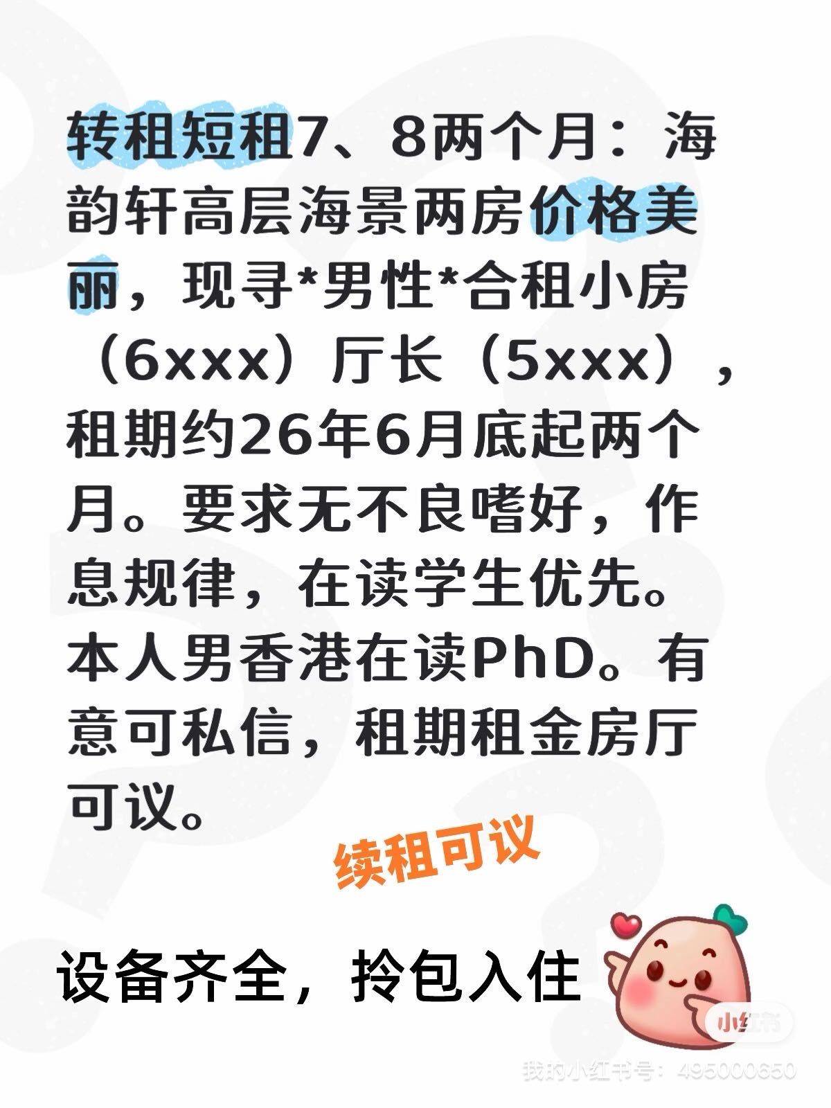转租短租7、8两个月:海韵轩高层海景两房价格美丽,现寻*男性*合租小房()厅长(),租期约26年6月底起两个月,续租可议。要求无不良好,作息规律,在读学生优先,设施齐全,拎包入住。本人男香港在读PhD。有意可私信,租期租金房厅续租可议。 红磡海韵轩酒店(Harbourview Horizon) 配备浴缸储房冰箱洗衣机一体机。 紧邻红磡站(两站金钟,两站九龙塘)、红隧以及香港理工大学。酒店内配备免费的露天无边泳池、健身房和往来于酒店、红磡站(5分钟)以及尖沙咀(13分钟)的穿梭巴士。 窗外是维多利亚港,中环上环和铜锣湾海景。