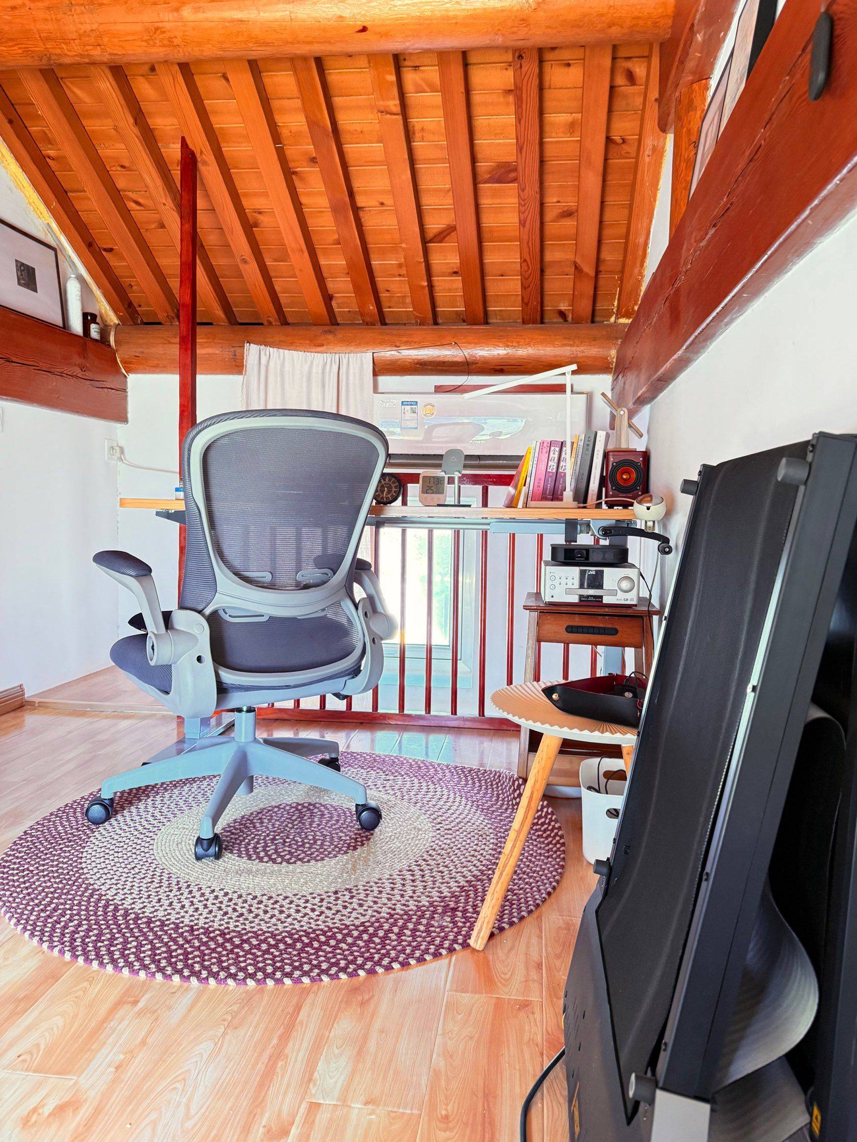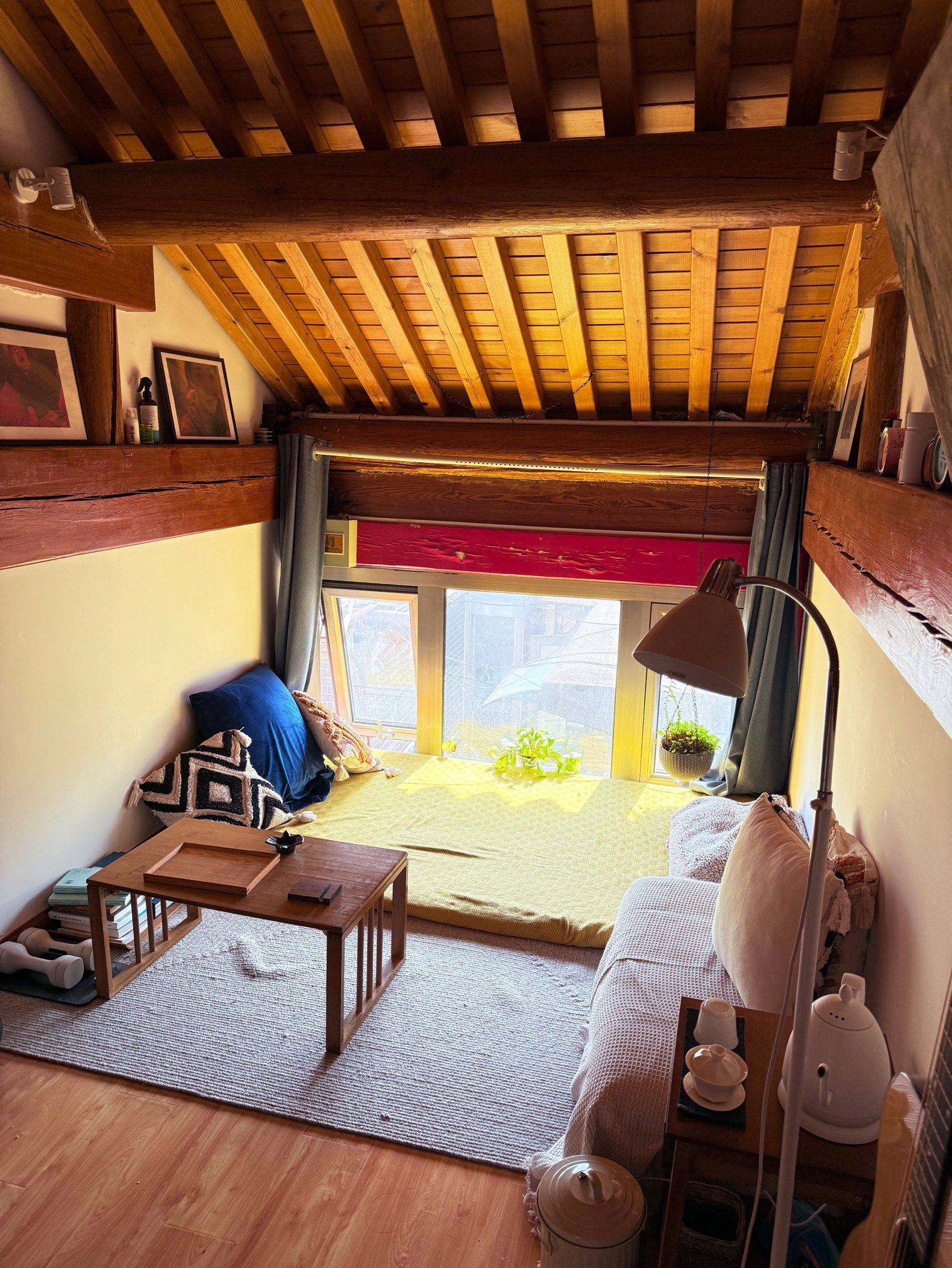 房子临街两层共 20 平米左右,南北通透,独门独户,有地暖卫浴。院子曾是某蒙古王爷府,从广亮大门往外看是宽敞的干面胡同,打车外卖、快递都可到门口。 一层麻雀虽小五脏俱全。一半是榻榻米茶室,榻榻米下面可储物,茶几可升降。另一半左侧是整体橱柜(包括电磁炉、微波炉、厨具和餐具)、冰箱、洗衣机,右侧是洗手间(可洗澡)和简易衣柜。 二层是卧室兼书房。木屋顶、木纹地板。有多层地垫、茶几、书桌、转椅、音响、投影仪和走步机。白天光线好,打开南北窗通风,空调可制冷制热。