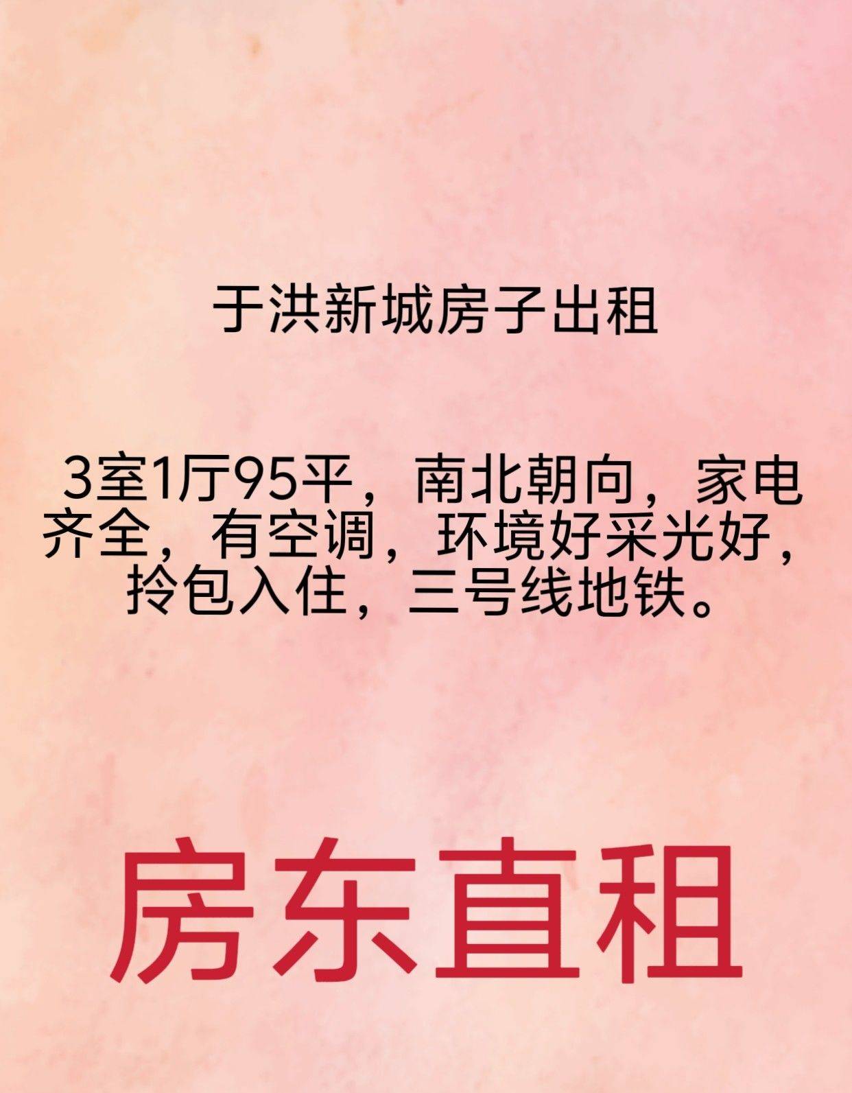 沈阳市于洪新城3室1厅95平,南北朝向五楼(一共六层)没电梯,半年付1400/月 ,年付1300/月,家电齐全,有空调,环境好采光好,拎包入住,不能养宠物,不能当员工宿舍。