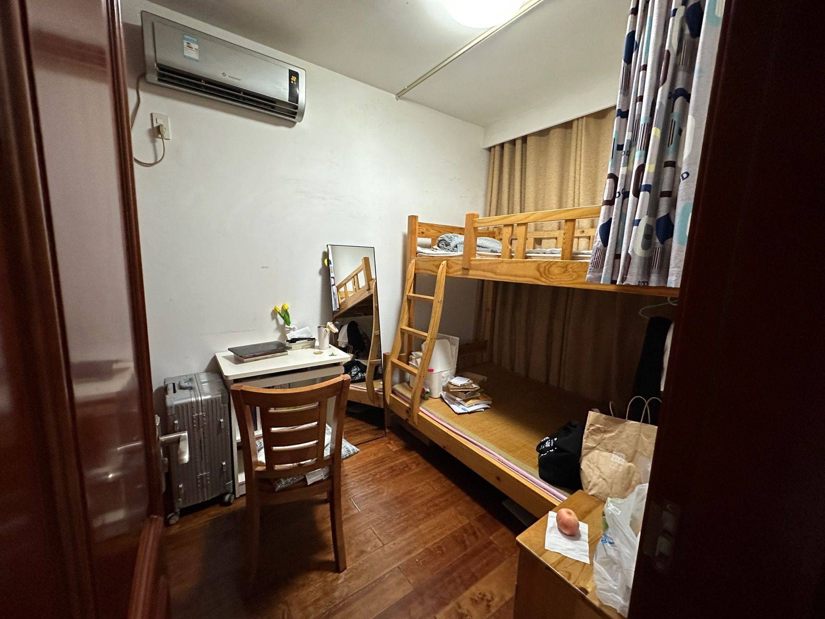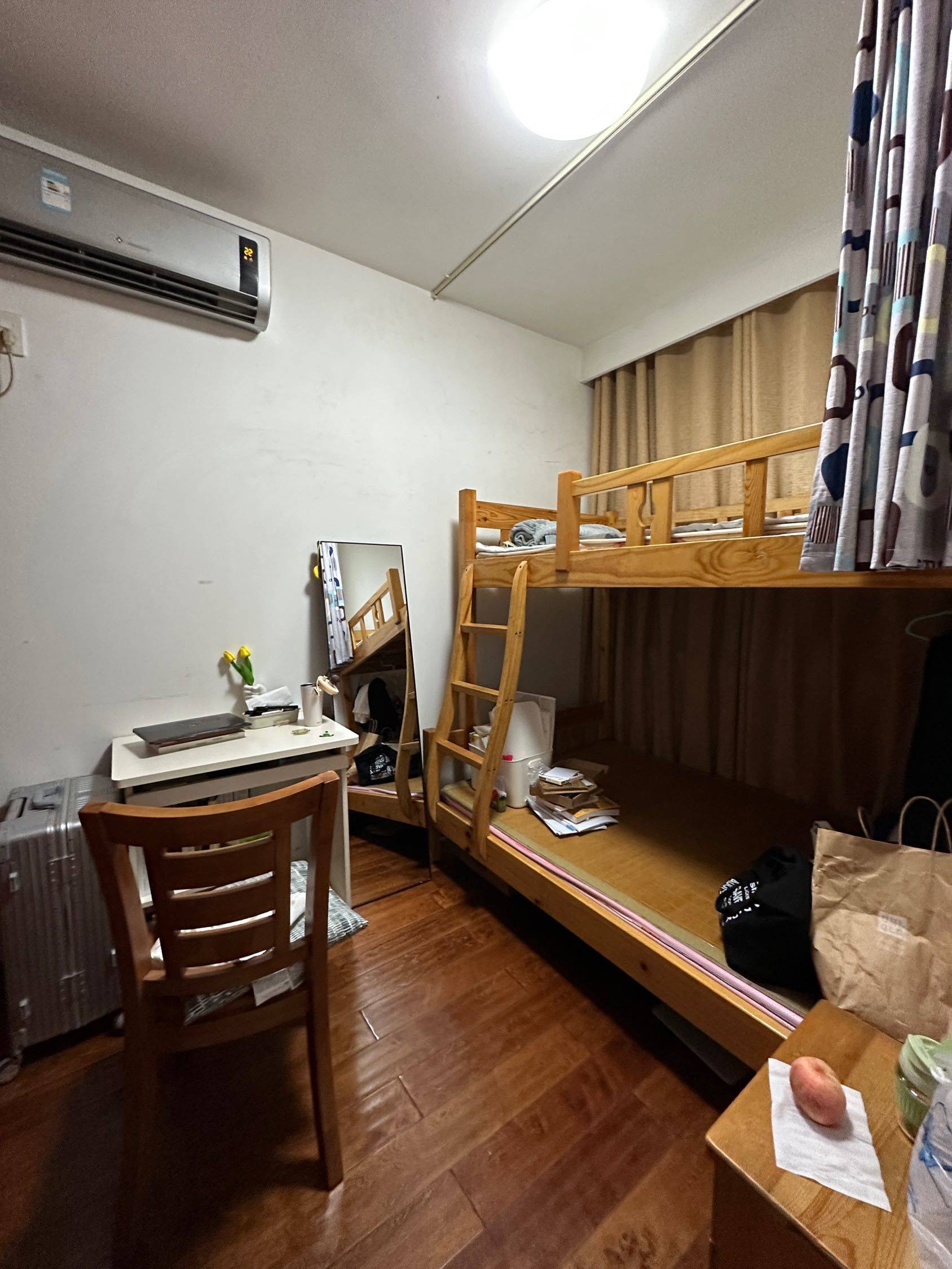 朝北单间带独立阳台,原户型无隔断,有床垫,上下铺的实木床大小尺寸还可以,一个可以用来睡觉,还有一个可以放东西挂衣服等,很实用!小区门口有直达地铁公交,步行也可以。总之出行很方便,周围配套设施齐全,小区环境好,整洁安全。