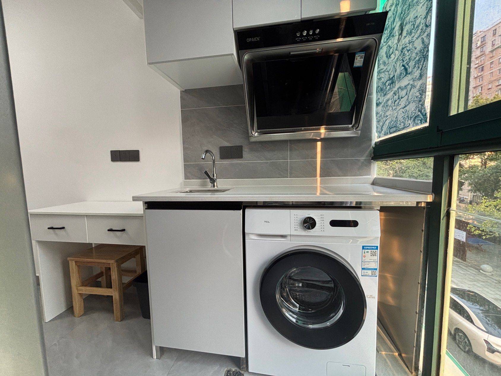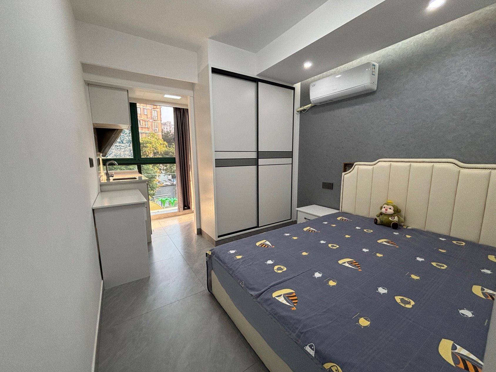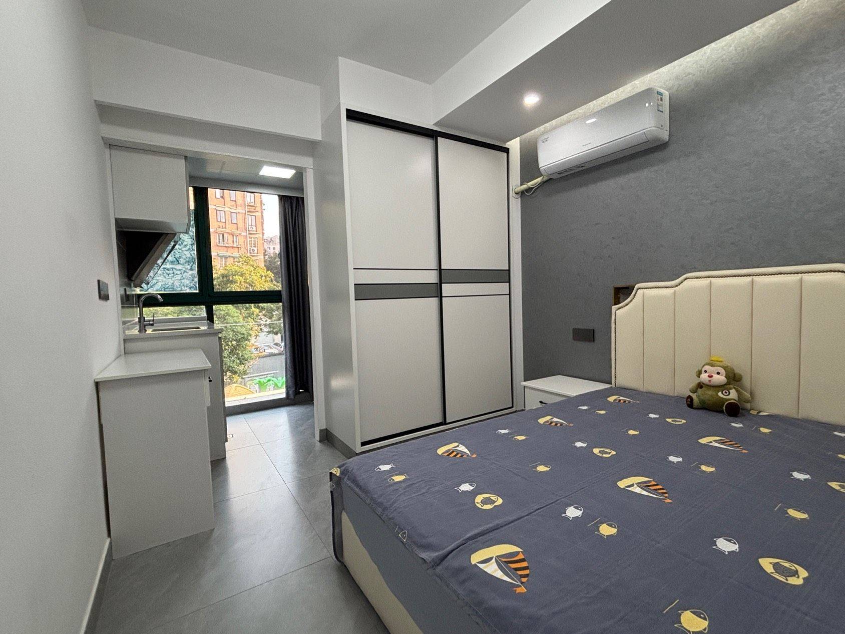 单间十小阳台、精装、布局整洁、双人床、独立厨卫、干湿分离、设备齐全、大冰箱、10公斤滚筒洗衣机、变频格力空调、朝南、彩光好、安静舒适.