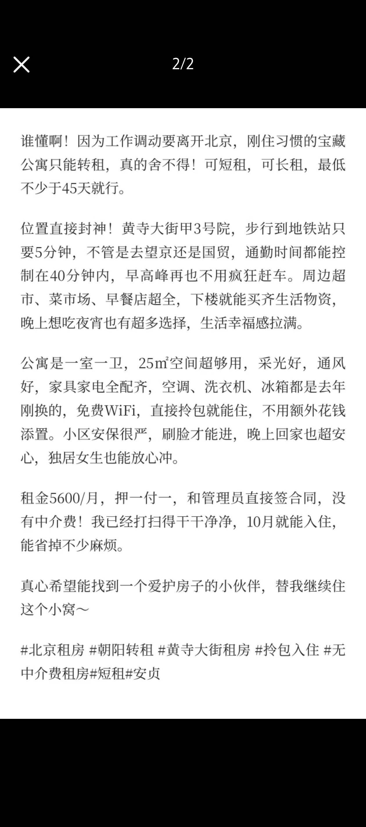 黄寺大街甲3号院电梯公寓,25㎡一室一卫,采光通风好,家具家电齐全,生活便利,押一付一,租金5640/月,10月可入住,无中介费,安全无噪音,适合爱干净、短租人士,适合独居女生,有意者联系。我愿意补贴2000元房租,您住45天左右即可,随便问。