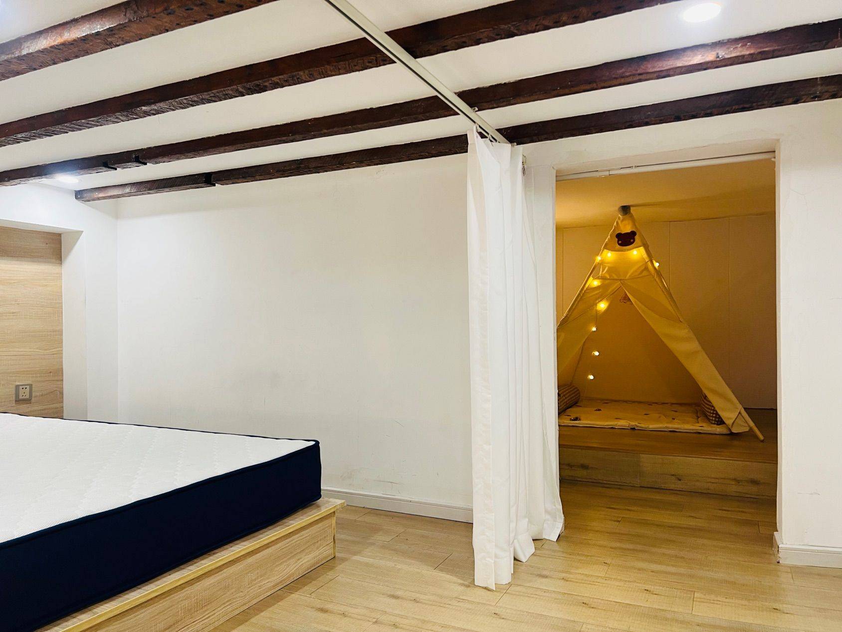 房子已空出,可随时预约看房 淮海中路进出方便,可居家和做工作室 乐安坊小区门口就是淮海中路,距离地铁站200米,周边就是复兴公园INS新乐园,思南公馆,新天地,步行到南京路仅10分钟。 三层楼小洋房的一楼,带小庭院(已做成阳光房) 房型是层高4米的复式Loft(2室2厅1卫) 南面电子防盗门入户进来就是阳光房,大概10平米左右,可作为喝茶聊天的休闲空间,也可作为工作区域。 阳光房再往里是下层式客厅,休闲空间超大,开放型厨房有脱排油烟机,电磁炉可做简餐。 布艺沙发(可打开秒变双人床),电器有冰箱、洗烘一体洗衣机、微波炉、投影电视。 沿楼梯上去是楼上居住空间,分前后两间,前间有超大的双人床,后间是榻榻米上面有一个儿童小帐篷,也可做成储物间。 卫生间干湿分离,燃气热水器。 水、电、煤气都是民用的。 At the entrance of the community is Huaihai Middle Road, 200 meters away from the subway station, surrounded by Renaissance Park INS New Paradise, Sinan Mansion, Xintiandi, and only 10 minutes' walk to Nanjing Road. The first floor of a three story small western-style house with a small courtyard (already converted into a sunroom) The room type is a 4-meter-high duplex loft (2 bedrooms, 2 living rooms, and 1 bathroom) The south electronic anti-theft door leads into the sunroom, which is about 10 square meters and can be used as a leisure space for drinking tea and chatting, as well as a work area Further inside the sunroom is a lower level living room with a spacious leisure area. The open kitchen has a range hood and an induction cooker for light meals. Fabric sofa (can be turned into a double bed in seconds), electrical appliances include refrigerator, washing and drying integrated washing machine, microwave oven, and projection TV. Going up the stairs is the living space upstairs, divided into two rooms. The front room has a large double bed, and the back room is a tatami mat with a children's tent on top, which can also be used as a storage room. Toilet dry wet separation, gas water heater. Water, electricity, and gas are all for civilian use. The house is currently vacant and can be viewed at any time