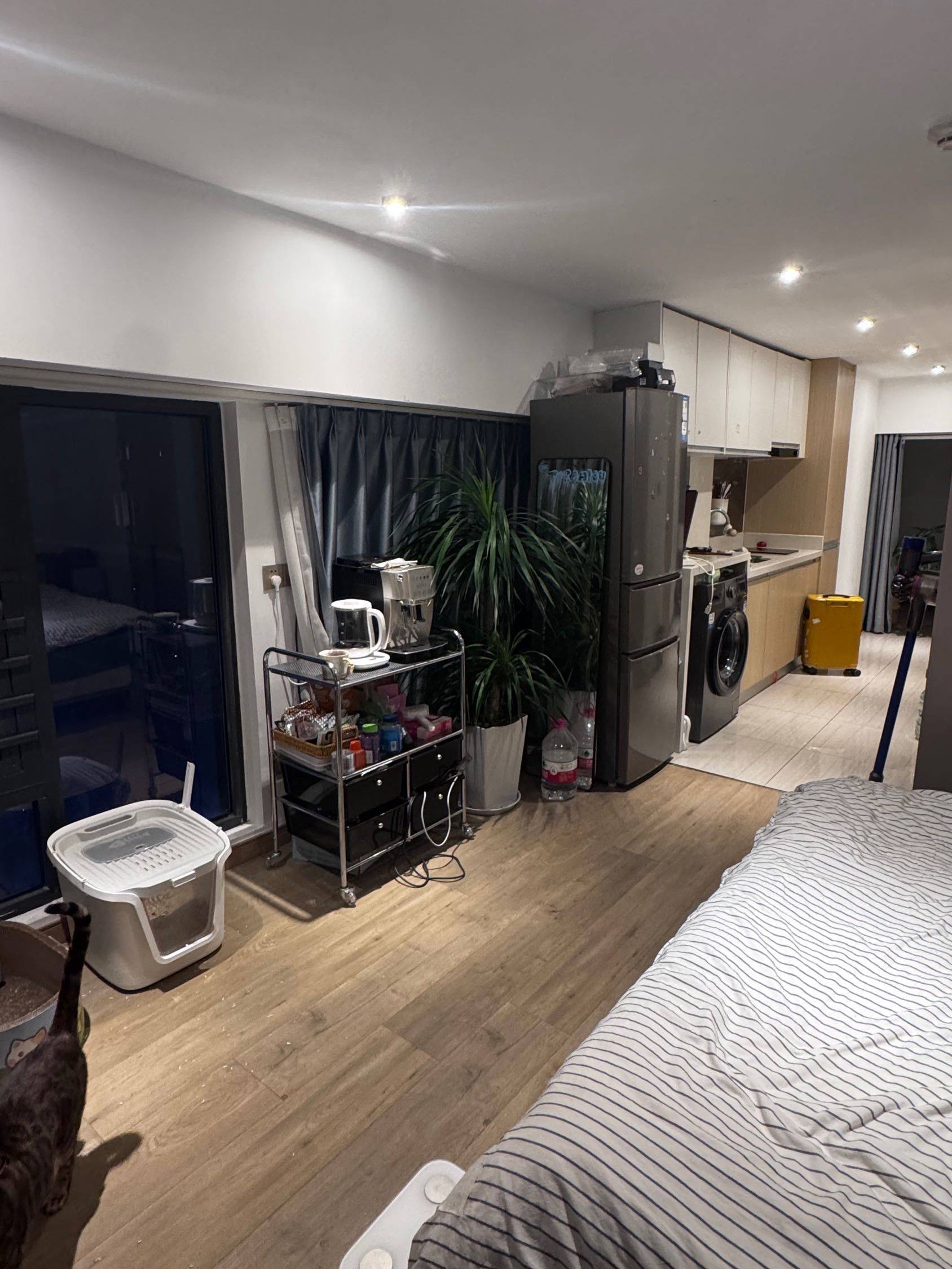 -房间格局一个人住刚好,有客人来也不影响,有两张床,小房间的床是我买的3000多,不搬走了,是上一家租房时候买的,实在不想再搬了; -采光很好,180度落地窗,太阳出来我的猫可以很舒服的晒太阳,我会在阳光中吃早餐; -很方便,离地铁3号线步行5分钟 -楼下就是超市,能买点生活必需品; -楼下有餐厅、早餐店、理发店、宠物店、美容店、水果店,生活很便利; -对面就是一个很漂亮的公园(桃花湖公园),夏天还有满池塘的荷花,很治愈; -步行龙湖天街10分钟。里面很多吃的,UR,优衣库,星巴克啥都有,也有健身房,价格也不贵; -步行20分钟就有一个体育馆,可以打所有的球,还有赛级泳池,价格也不贵; 如果自己做饭买菜也很方便。住着很舒服,我是因为工作原因要搬。 租约到2月份,可以短租到这个时间。如果要长租也可以和房东续,房东人很好。 邻居都是年轻人,平时遛狗聊天都很nice。 wifi也到2月,可以送给你。