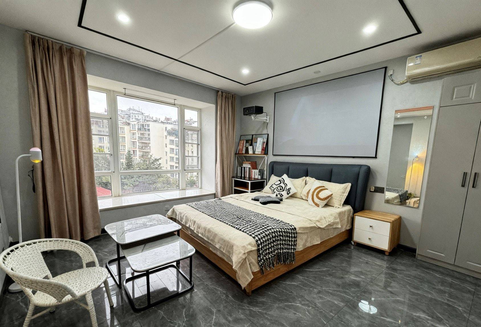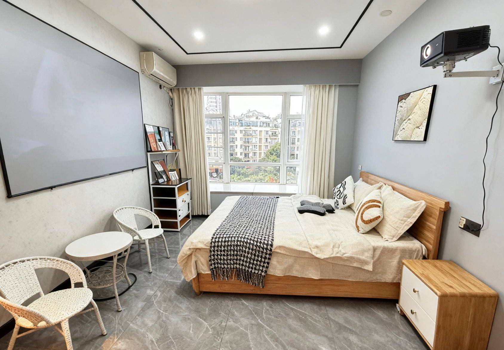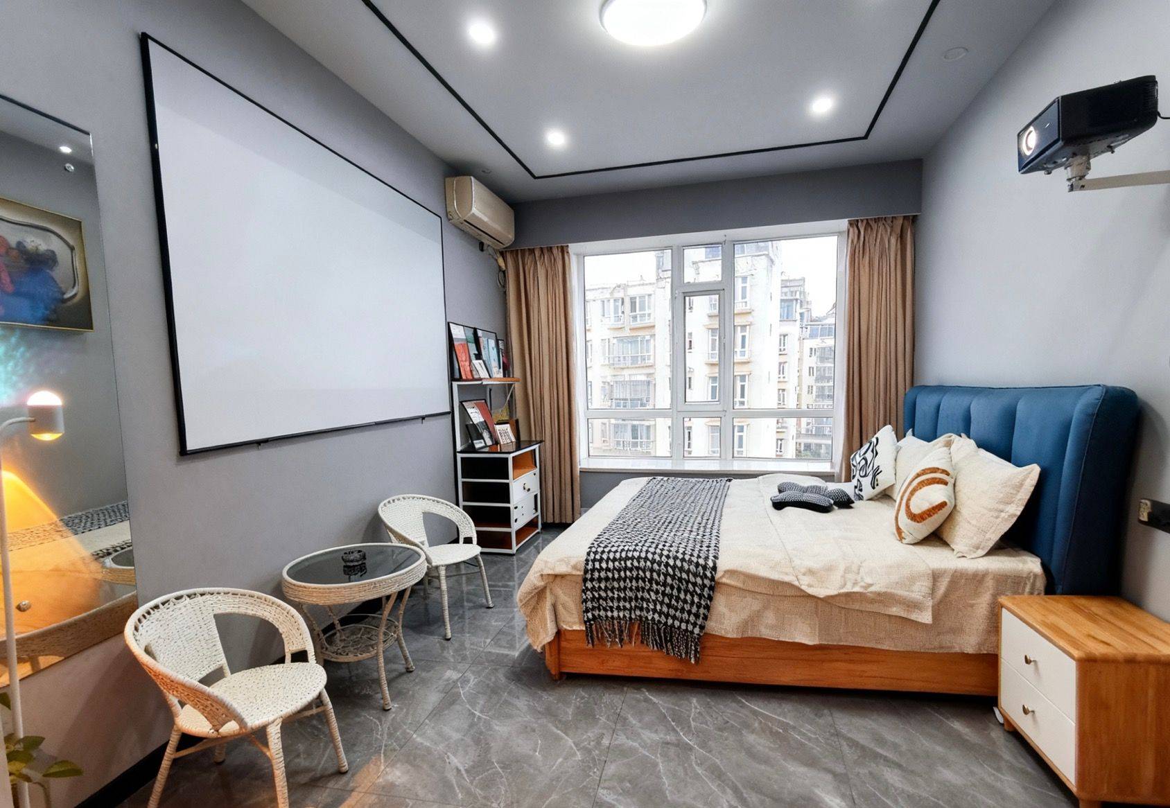 核心buff:卧室秒变影音房 墙嵌巨幕投影+环绕式灯光,下班躺床就能沉浸式追剧/看电影,氛围感直接碾压普通出租屋! • 软装细节全拉满 浅灰+原木配色高级又温馨,软包床头+质感床品躺着巨舒服;藤编桌椅+小茶几,朋友小聚/独处放空都有专属角落~ • 生活超省心 大窗采光足,定制衣柜+收纳架空间管够,家电齐全直接拎包入住! 随时看房!这种“躺平式”单间真的手慢无!