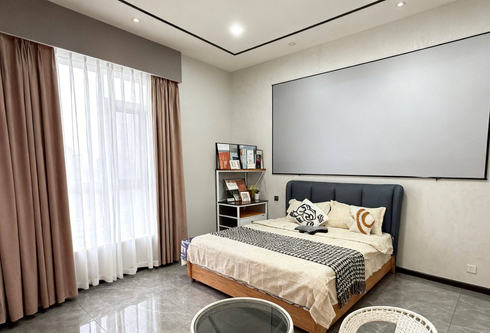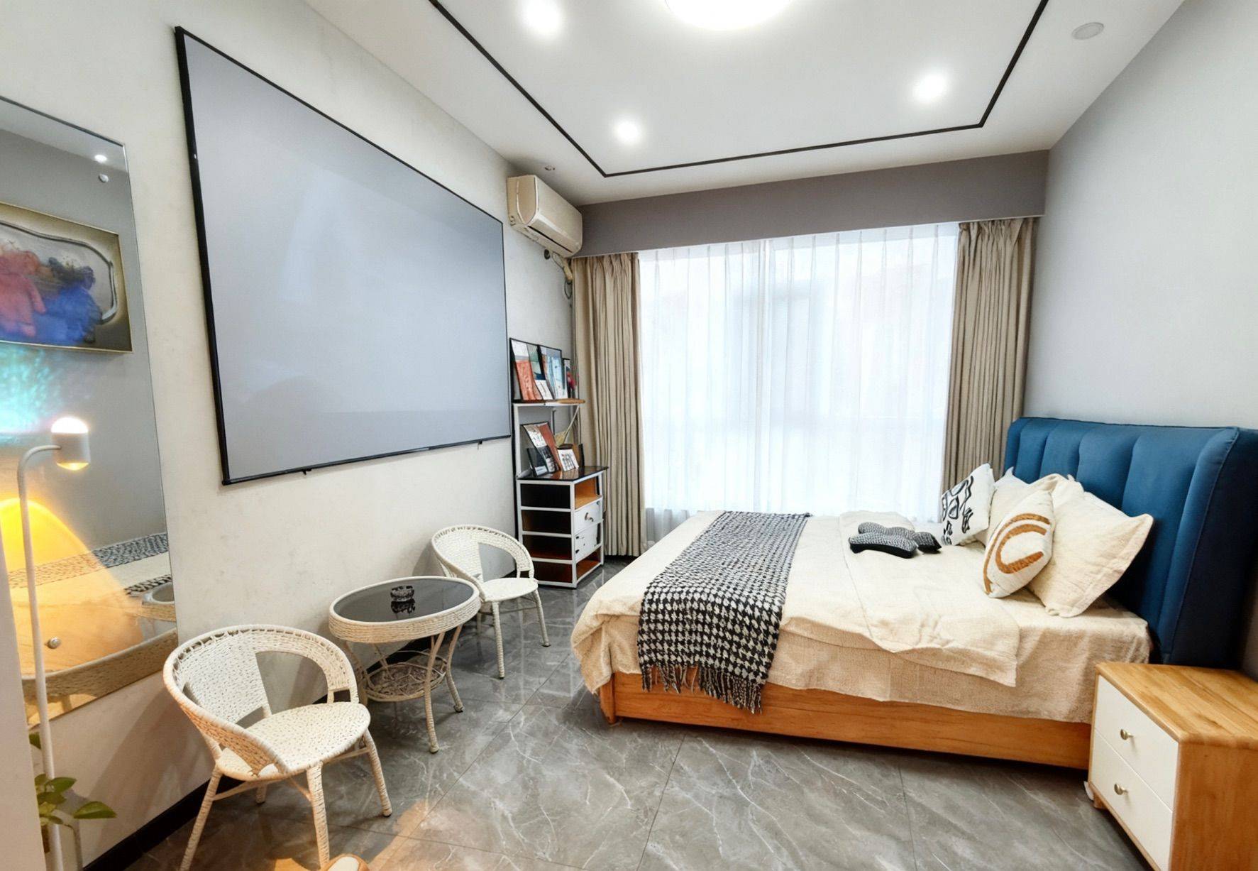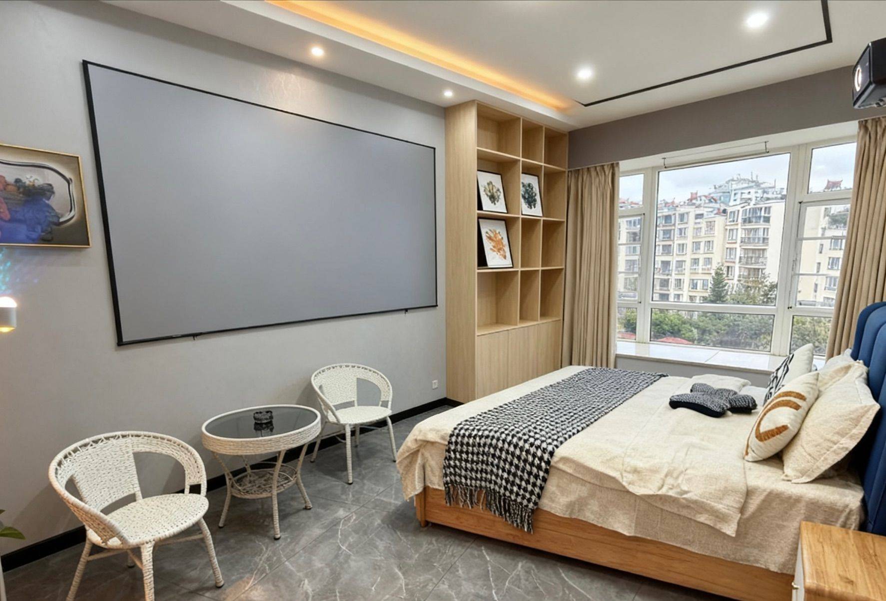核心buff:卧室秒变影音房 墙嵌巨幕投影+环绕式灯光,下班躺床就能沉浸式追剧/看电影,氛围感直接碾压普通出租屋! • 软装细节全拉满 浅灰+原木配色高级又温馨,软包床头+质感床品躺着巨舒服;藤编桌椅+小茶几,朋友小聚/独处放空都有专属角落~ • 生活超省心 大窗采光足,定制衣柜+收纳架空间管够,家电齐全直接拎包入住! 随时看房!这种“躺平式”单间真的手慢无!