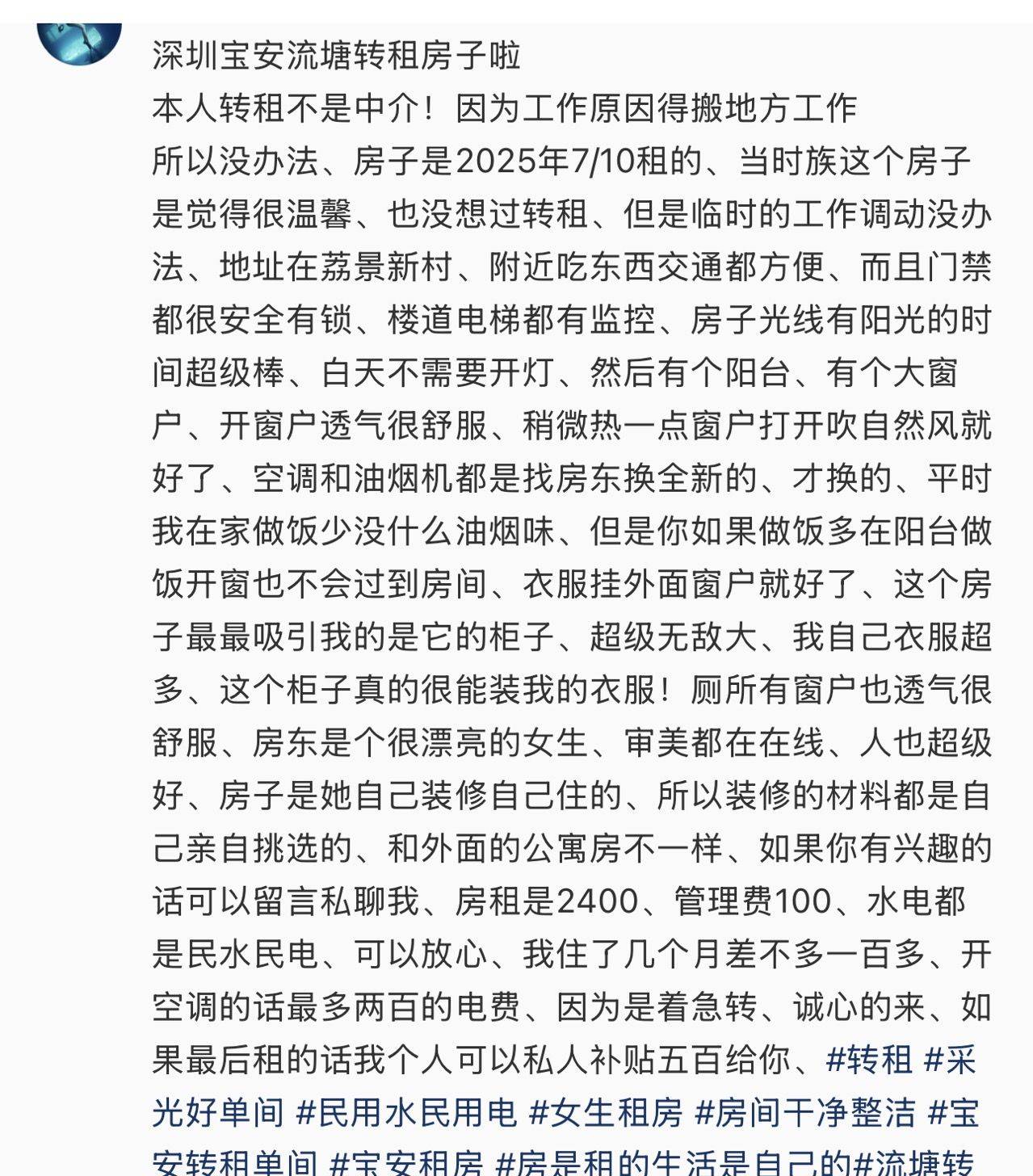 房子位置在荔景新村40栋11楼然后光线都很好很舒服、压二付一、租金2400、因为个人工作原因着急转租、个人可以补贴1500