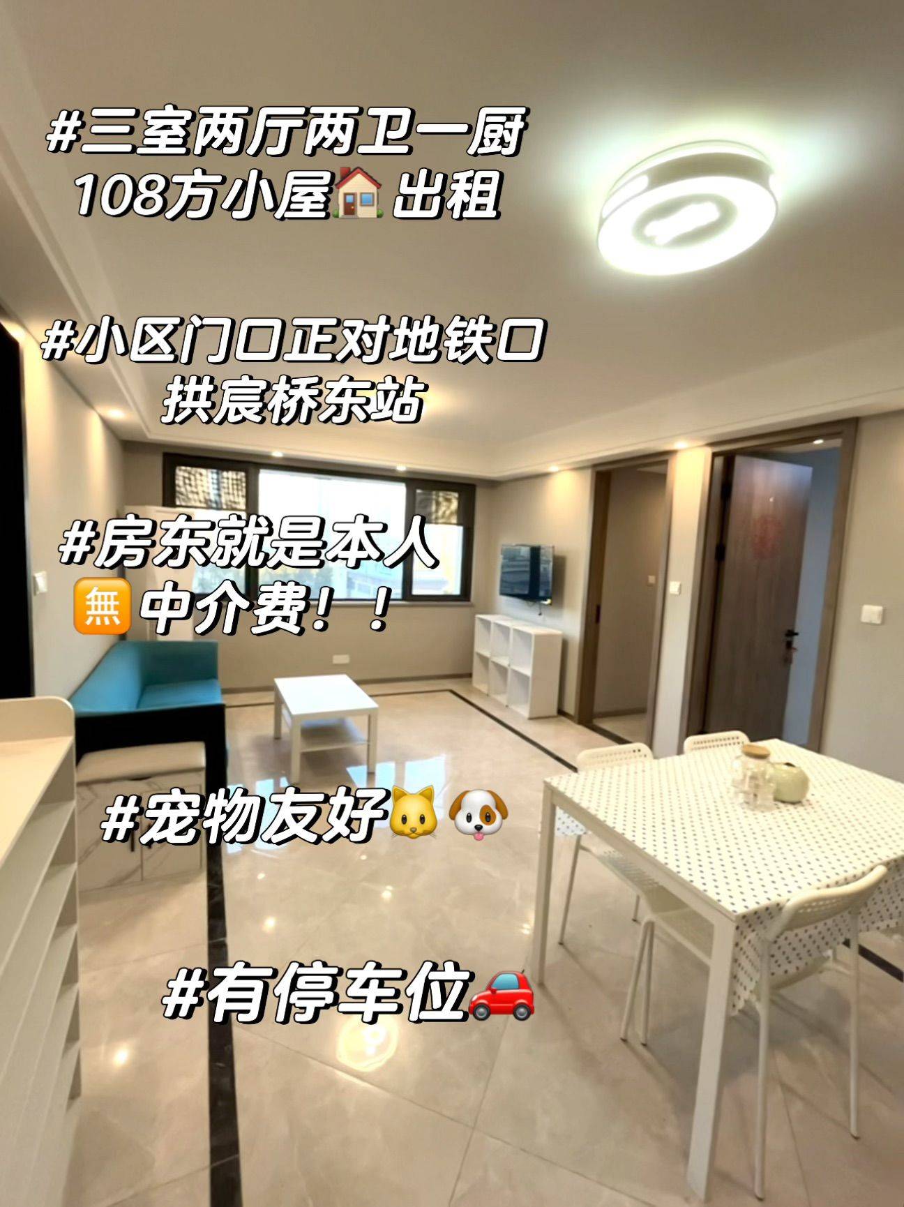 1️⃣拱墅区宸麟府,门口就是地铁站 2️⃣108方 三室两厅两卫一厨房,房间都朝南,采光非常好,闺蜜合租或家庭🧑🧑🧒用房都很推荐!! 3️⃣有车位,民水民电,宠物友好🐱🐶 4️⃣家电家具齐全,品质在线,一律大品牌。都是自装的,材料安全环保,杜绝出租屋装修🫸 5️⃣房东就是本人,可直接与我联系,看房不收费 感兴趣的可直接私信主波问价,有一镜到底视频