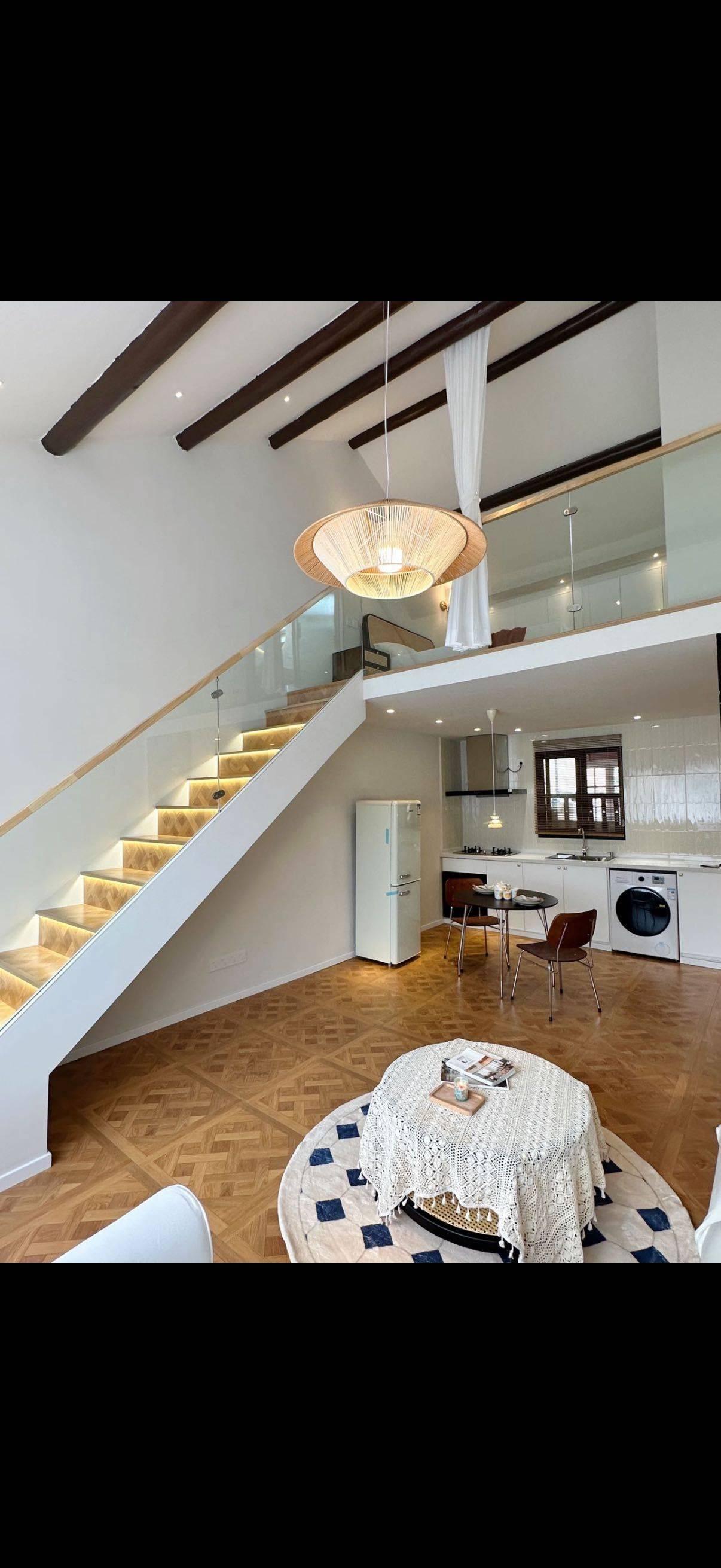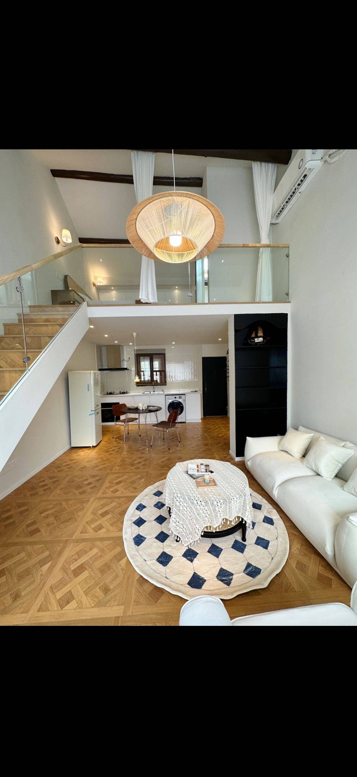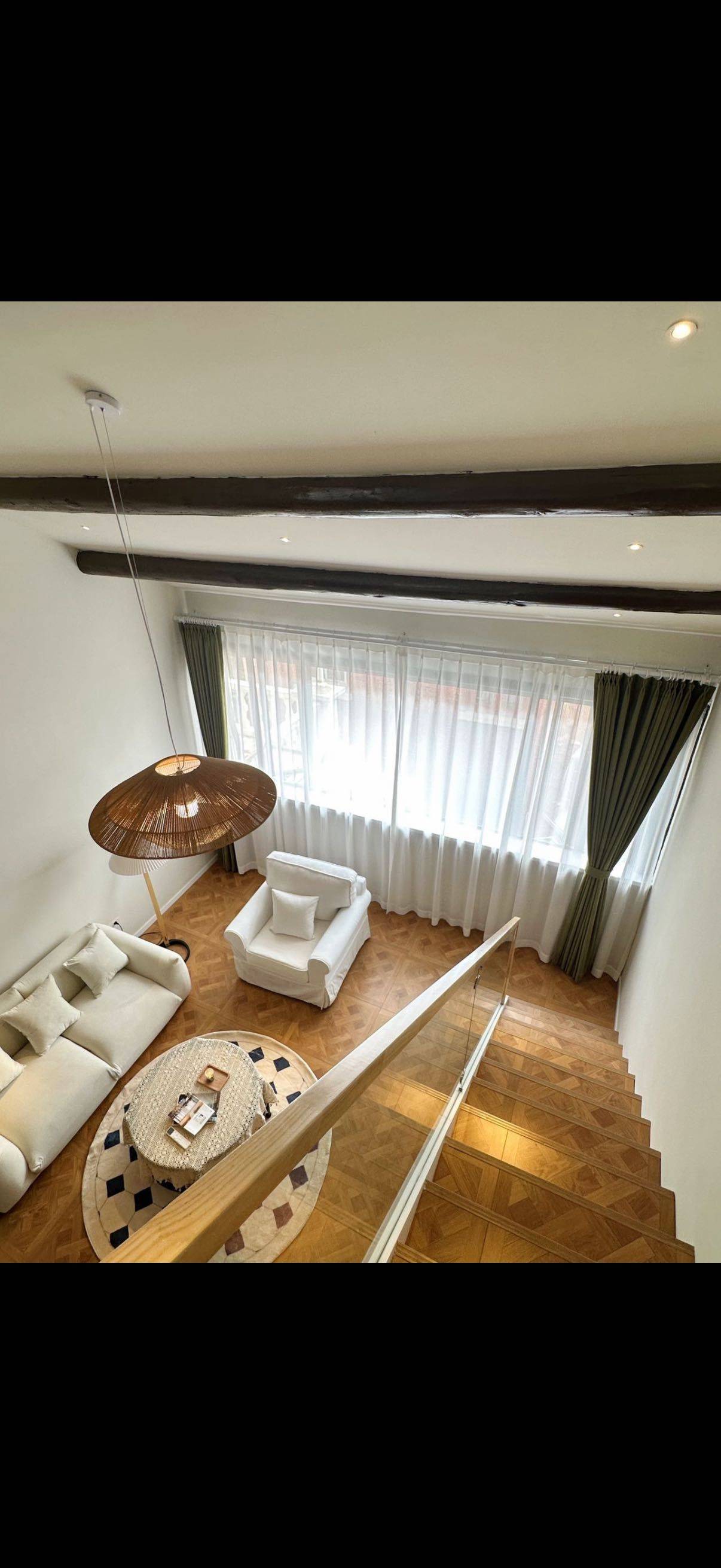 Flat in French Concession on 3rd floor, loft style with very high ceiling. Modern interior and very quiet at night. Air Conditioning + Floor Heating + Oven + Panoramic Windows + Open Kitchen