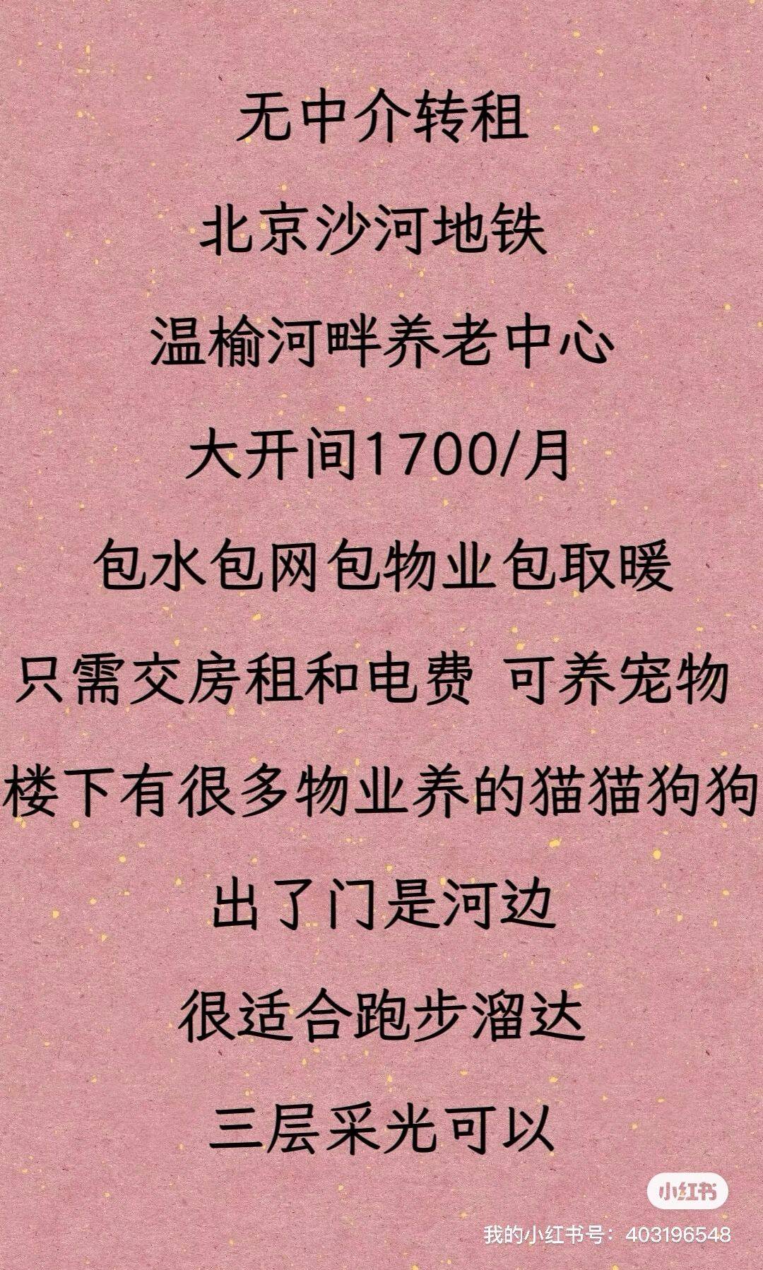 最后一张有联系方式北京沙河大单间转租!!便宜好住! 个人转租!不是中介! 因为工作调动现转租[苦涩] 位置:昌平区沙河温榆河养老中心公寓,三楼大开间, 交通:距离沙河地铁站一公里多,骑电车十分钟,早晚有班车接送路程7分钟,图有班车发车时间表,门口也有共享单车电动车,交通很方便🚗 周边:具多吃的于辛庄松兰堡,下班顺路可以买菜做饭,也有很多堂食饭店和小吃摊,楼里一层也有百货商店,日常生活都能满足 环境:可养宠物🐈⬛,物业有养好多猫猫狗狗,吃不完的饭我有时候还会给小狗吃,楼下有丰巢快递柜,出门就是温榆河边,钓鱼野餐不在话下,附近有物美商场和玖耀里广场 只需交房租电费,包水费包物业费包取暖费包网费,近期搬走可来看房!