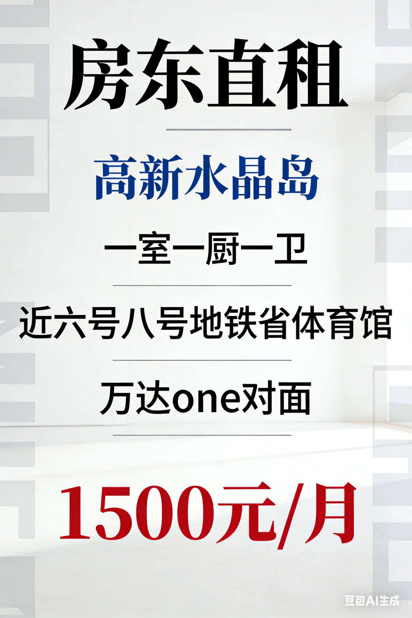 高新区一室一厅一卫整租,6号线8号线木塔寺省体育馆地铁站附近,西安高新水晶岛6层北向,远离马路,没有噪音,53.86平米,,70年产权,住宅性质,民水民电,带冰箱洗衣机热水器天然气和集中供暖,可做饭,拎包入住,下楼马路对面是万达one,往南是6号线省体育场地铁站,水单价3.8、电单价0.64、暖气费单价5.8,物业费129(包含电梯、垃圾清理、公摊电费),包宽带和包维修。本人自己的房子,可省去中介费。贴在房在,不接受转租,欢迎中介推广!