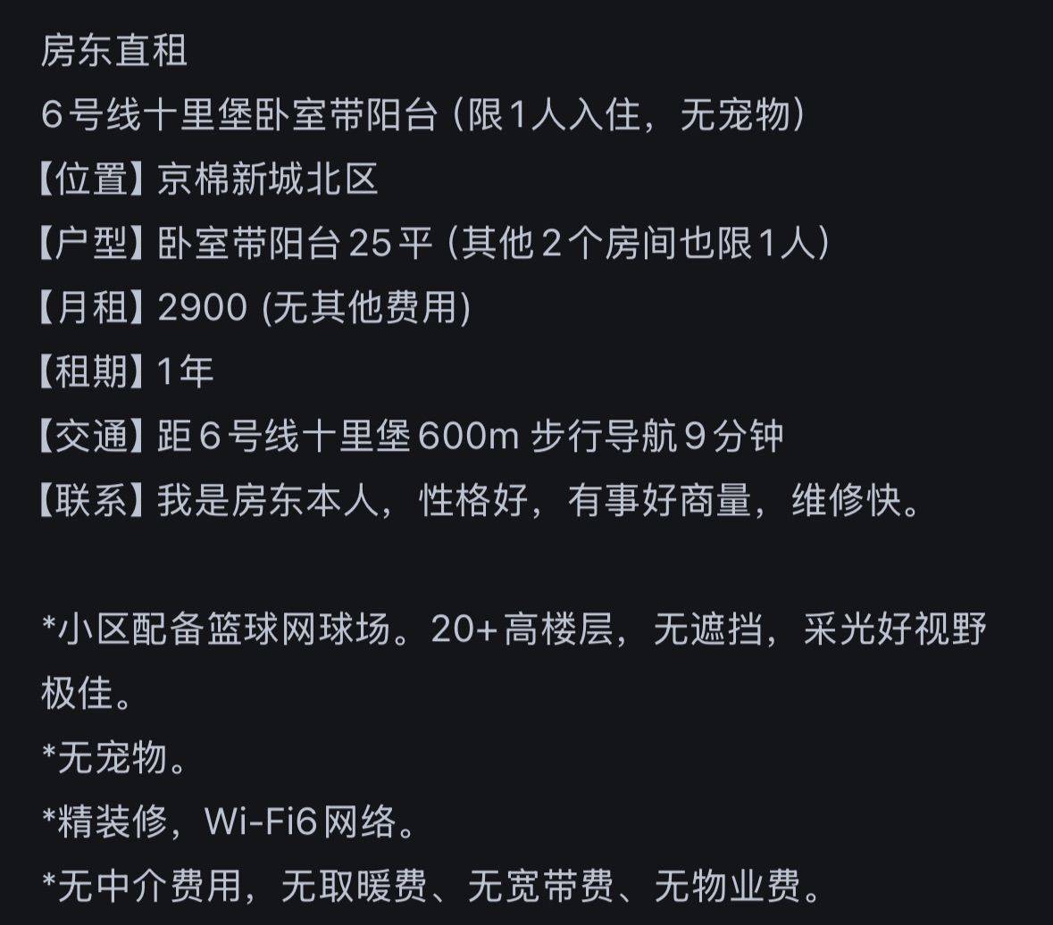 房东直租 6号线十里堡 卧室带小阳台(限1人入住,无宠物) 【位置】京棉新城北区 【户型】卧室带小阳台12平(其他2个房间也限1人) 【月租】2500(无其他费用) 【租期】1年 【交通】距6号线十里堡600m 步行导航9分钟 【联系】我是房东本人,有事好商量,维修快。 *小区配备篮球网球场。20+高楼层,无遮挡,采光好视野极佳。 *无宠物。 *精装修,Wi-Fi6网络。 *无中介费用,无取暖费、无宽带费、无物业费。