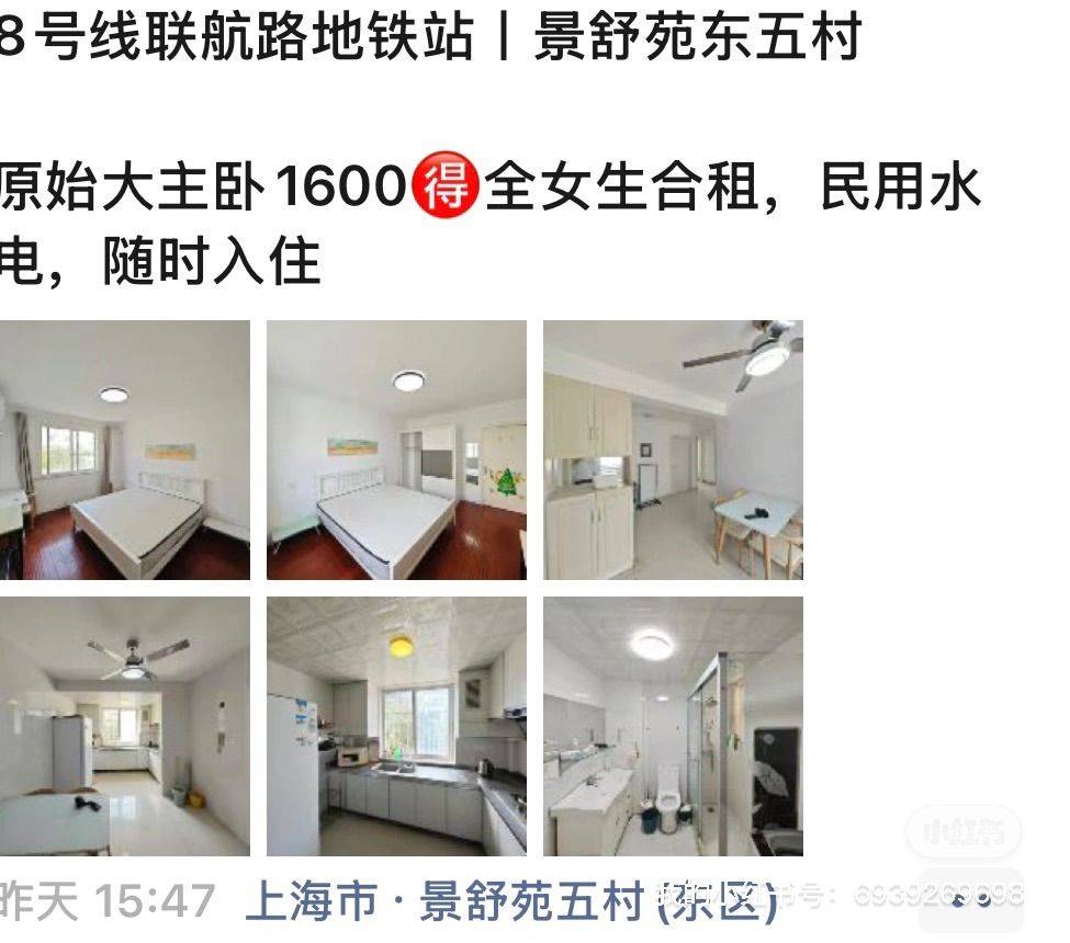 浦江镇个人转租!!! 个人转租,无中介费!!! 合同26年6月底到期,每月16张,押一付一 本人因工作变动原因,准备转租,室友都是女生,而且非常爱干净,也很安静,尤其是公共区域,非常干净!!!房间采光超级好,房间蛮大的。 景舒苑东五村主卧转租|全女生合租 三室一厅一厨一卫,房间朝南,干净整洁,采光非常好 距离联航路地铁站骑单车10mins左右,门口也有共享单车和公交站 包网络,可燃气洗澡做饭,很方便 仅限女生入住 民用水电,随时约看房,拎包入住没问题 床1.8米,床垫厚实,睡着舒服 厨房、洗衣机、空调都有,生活方便 适合上班族、学生,交通方便 看房随时聊!