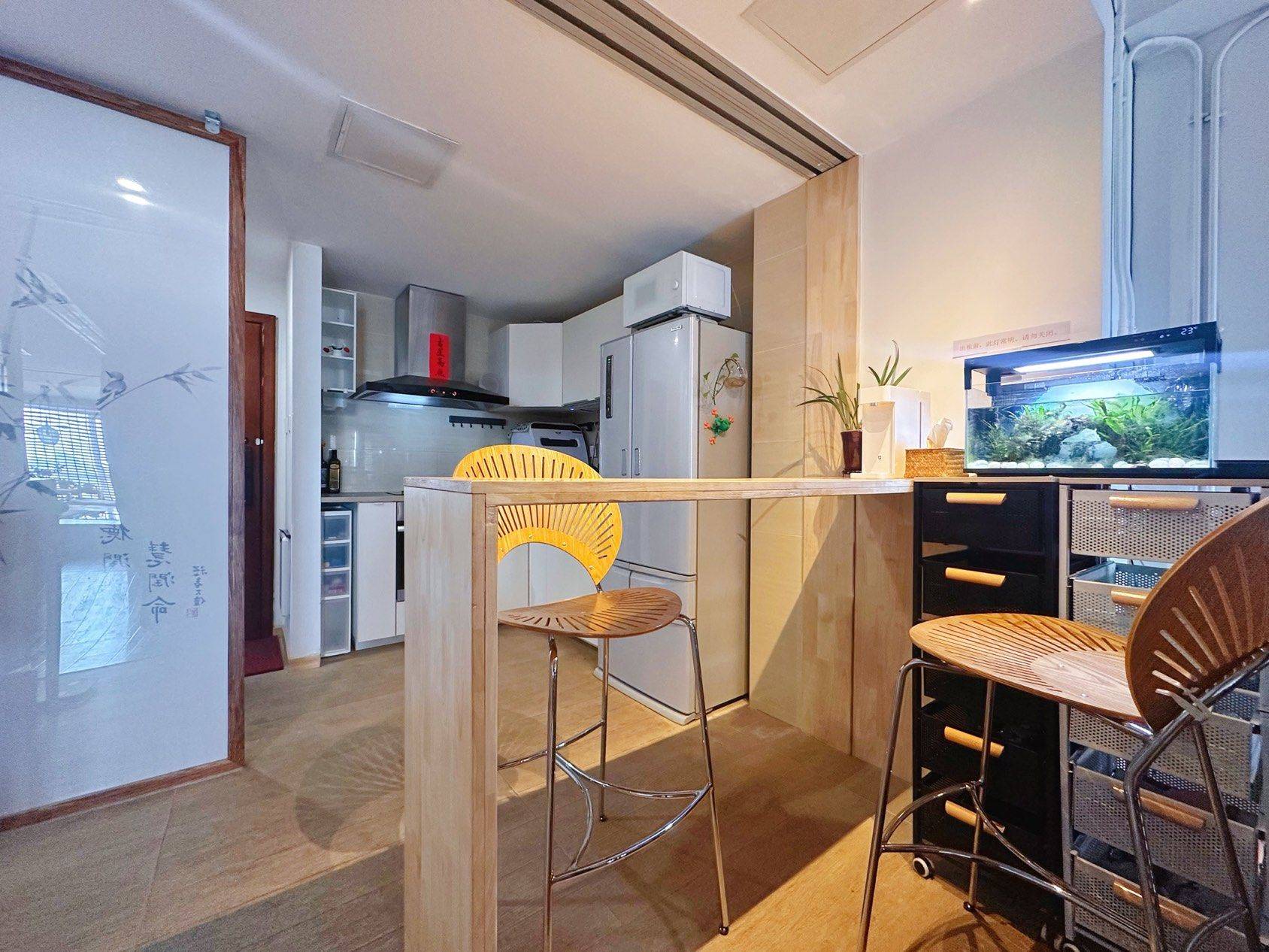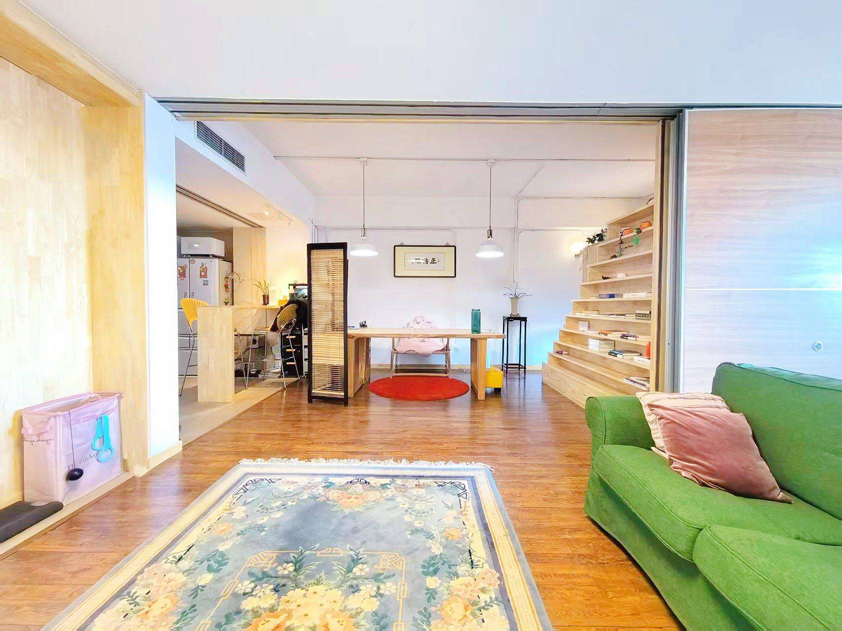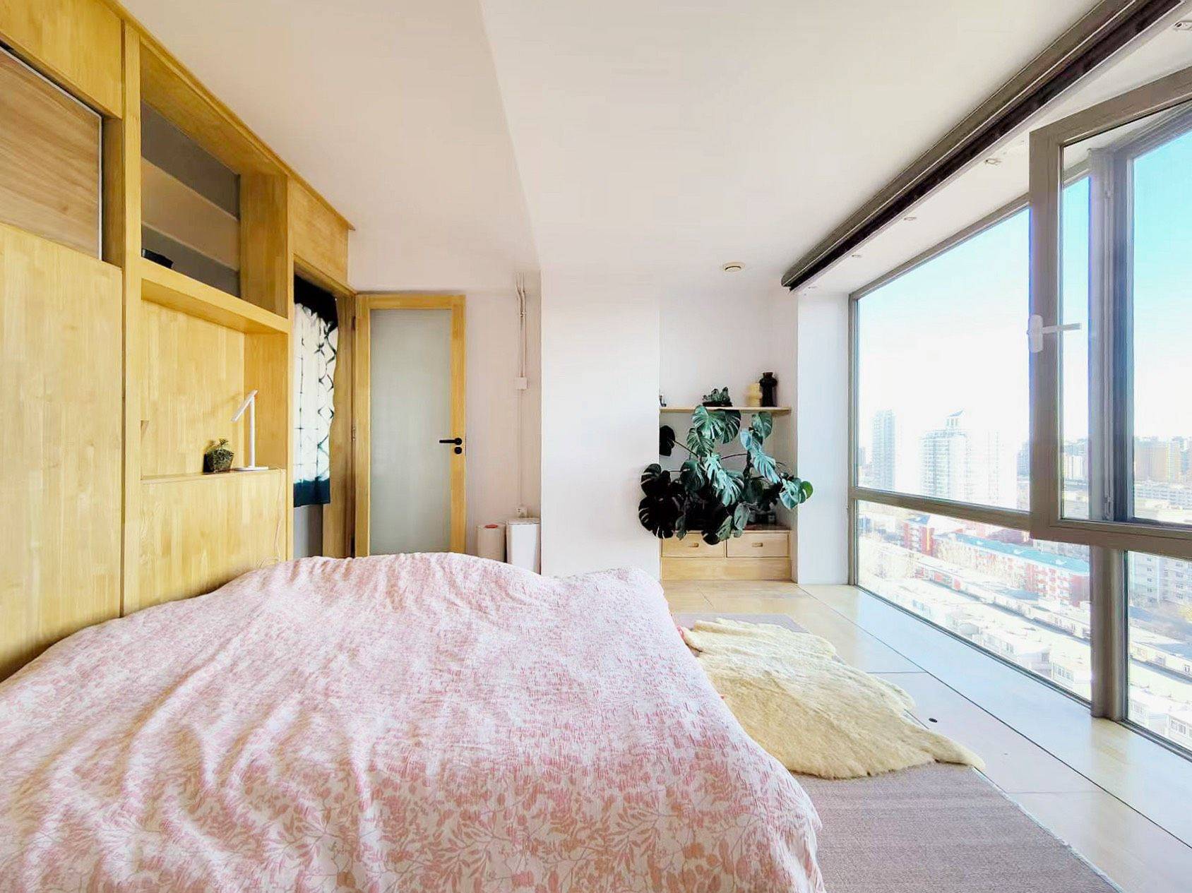 与先生准备常住泰国,所以出租这一套自住房。是我们的婚房,首次出租,由我们自己保养爱护了十年。 第一次遇见它时,大开间配正南大窗的格局,令人有一种仿佛海景房的感受。北京少有四方无缺角的房型,我们便果断买了下来。 装修时,为了不破坏“大开间”的开阔感,让建筑师朋友在屋子里用实木搭了一个活动结构——大开间瞬间变两房两室的快乐。收纳全部在地面,解放了近七米的建筑面宽。 榻榻米茶席,俯瞰通惠河的车水马龙 投影影音室,适合享受窝在沙发中的电影时光 实木大板桌,soho办公的舒适配套 楼梯式书柜,体验埋在书店里的静谧 “火车上铺”的设计、既打造了步入式衣橱、又偶尔可以睡在“上铺”回到童年😊 全屋德日系进口电器、卫浴设施。 公寓底下层与新商业体“田间田”无逢对接、超市健身不出楼。 过个马路就可以在英皇享受巨幕影院,周末步行玩转使馆区、十分钟步抵日坛公园享受五百年松柏林的能量滋养。 我们非常喜欢这套公寓,所以即便出国旅居也并未想出售它。希望可以找到欣赏它的人。😊