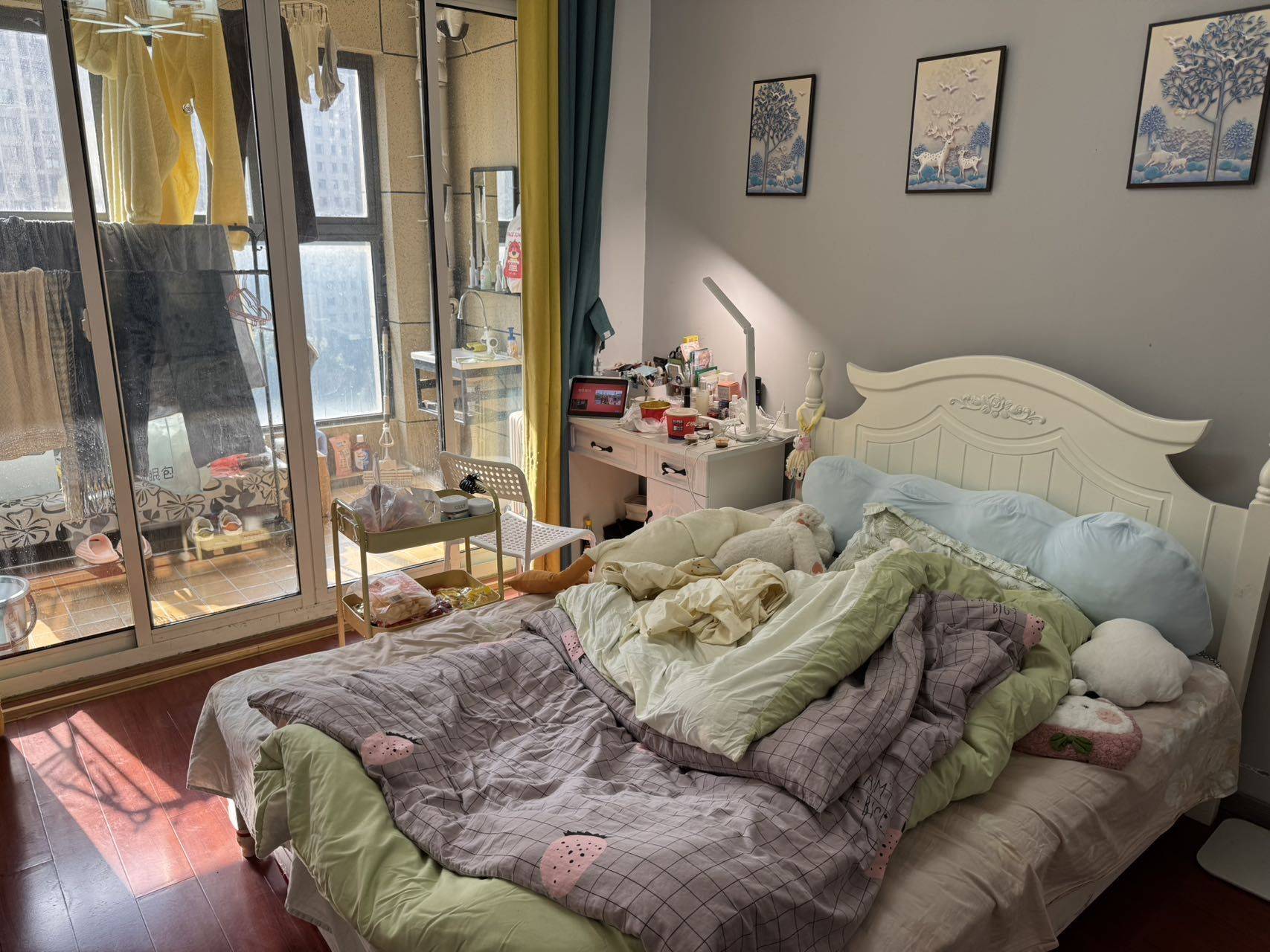 屋子虽然四室一厅,但是目前就住了两个房间,短时间应该是不会住进来租客,而且现在租出去的房间中,有个房间是有独卫的,所以这间卧室,也是相当于只有自己用卫生间。