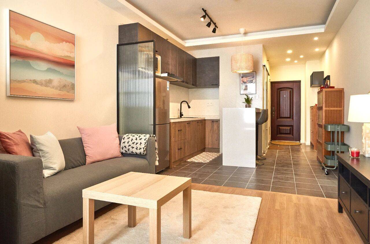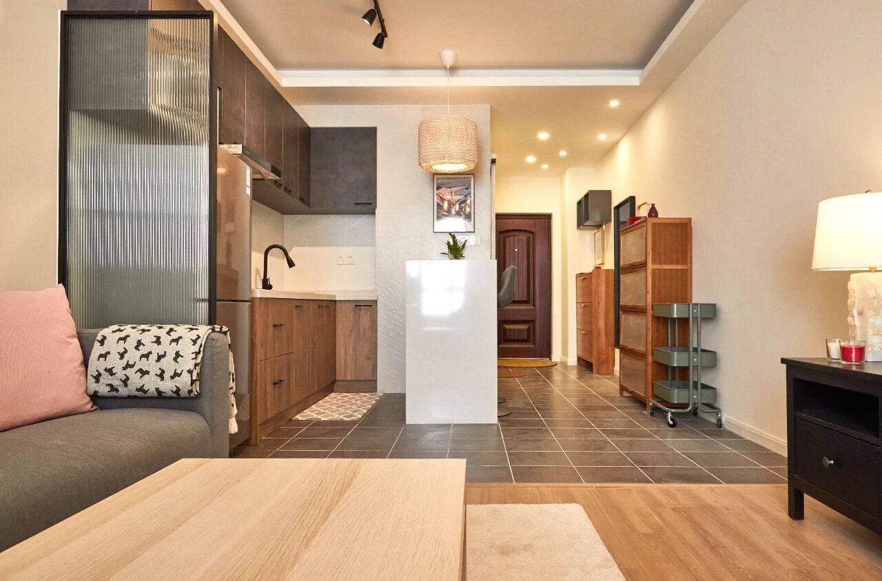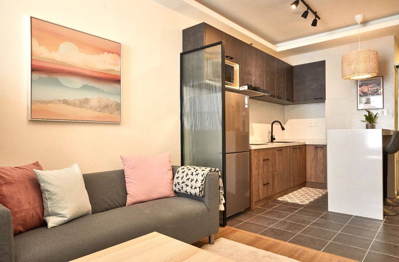 房子在长宁区威宁路2号线地铁站附近,电梯中区的一房一厅55平,有采光落地窗,是朝南的,采光很好,很温暖的房子,景观好,闹中取静。空间很宽敞,有大储物空间,中央空调,开放式厨房和岛台吧台,有洗衣机烘干机,卫生间厨房也很宽敞,住起来很舒服。
