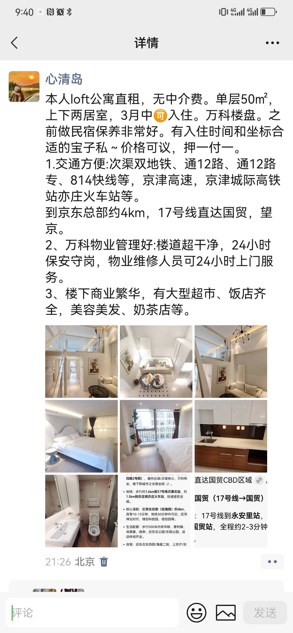本人房东。无中介费。3.26号租客退租。具体的详情看我的最后一张图片哈。 楼层和房屋保持都非常好。采光棒极啦! 离京东很近。离CBD也很方便。地铁站不远。楼下商超都很完善。物业管理非常好。楼上楼下有两个房间。