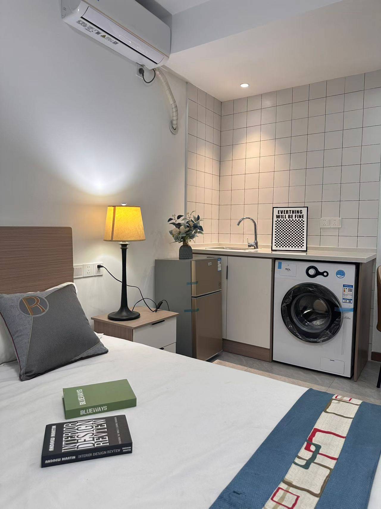 图片为同一栋楼样板房拍摄,真实无虚假 1 位置:拱墅区融创金成臻蓝府5幢云栖公寓,距离800米是4号吴家角港地铁站,楼下有自助健身房、超市。 2 房间:1室1卫,小区直营公寓(可申领杭州补贴),独门独户不是双钥匙也不是隔断,有甲醛检测报告(我自己入住之前也测过),隔音良好。 3 家电齐全:送WiFi!洗衣机、冰箱、空调、浴室风暖、电热水器,拎包入住⋯⋯ 4 租金:租金1800,压1付1,民用水电(电0.7水4),租金含物业费,本人因工作原因转租,合同到7月。 5 安保:楼道监控,大堂管家24h随时可以联系快递,外卖送上门,楼下就有蜂巢快递柜。 6 周边:宝龙、银泰、新天地 7 个人首月可补贴