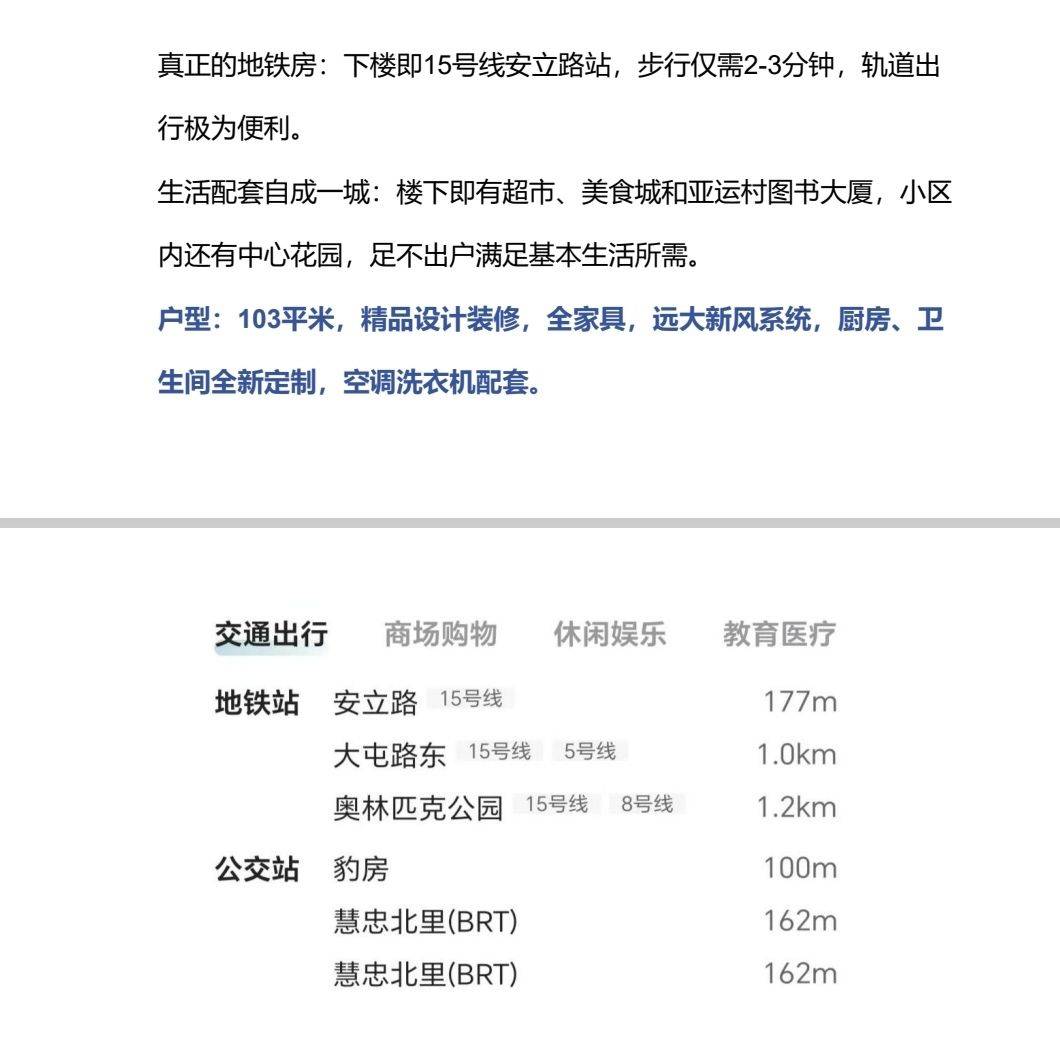 业主直租·设计师自宅 | 奥运公园旁·精装大两居103平米 【业主直租,中介勿扰】 📍 下楼即15号线安立路站,鸟巢、水立方、奥运公园步行可达。 🏠 全屋亲自设计,艺术审美在线 · 厨房、卫生间全新定制 · 远大新风系统、空调,暖气、全套品牌家电 · 精装交付,真正拎包入住 🎯 寻对生活品质有要求的个人或家庭 起租2年,长住为佳。有意请提前预约看房。