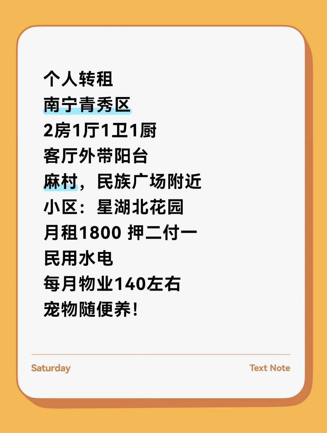 个人转租,无中介费,随时看房!立马入住 本人因工作关系搬去别的城市,现个人转租南宁青秀区房子,两房一厅,一卫一厨 小区:星湖北花园,电梯房 近两个地铁站:民族广场和麻村 即刻入住,3.9日前可以上门看房!等你滴滴 超级宠物友好!!随便养!猫猫狗狗家长看过来! 月租1800,押二付一,最少签到2027年5月7日 家具齐全,客厅外带小阳台,电梯房。两个房间都带床,其中一个目前没有床是因为我想做衣帽间,让房东搬走了。你来租,可以再搬回来。租房合同是和房东直签,信息透明。 房东是爱宠人士,很好相处