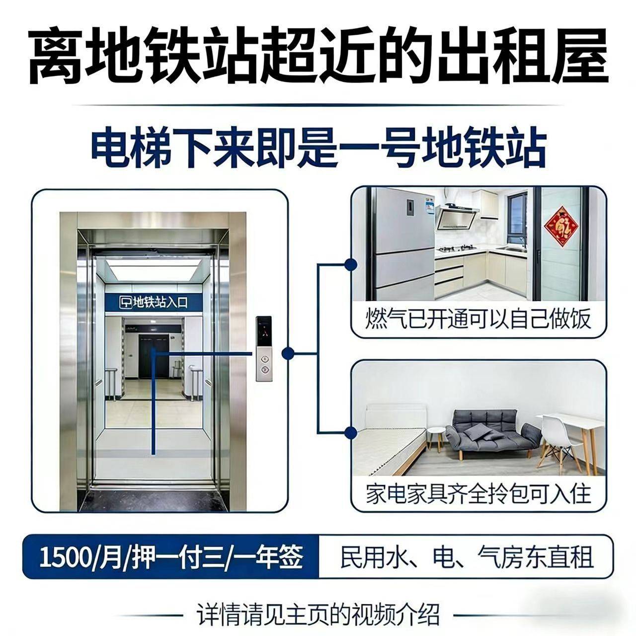 地铁口,民用水电,单独卫生间和厨房区域,通燃气可做饭,有单独阳台,情侣或单身小伙伴的首选,指纹锁方便快捷,单独梯控安全系数高