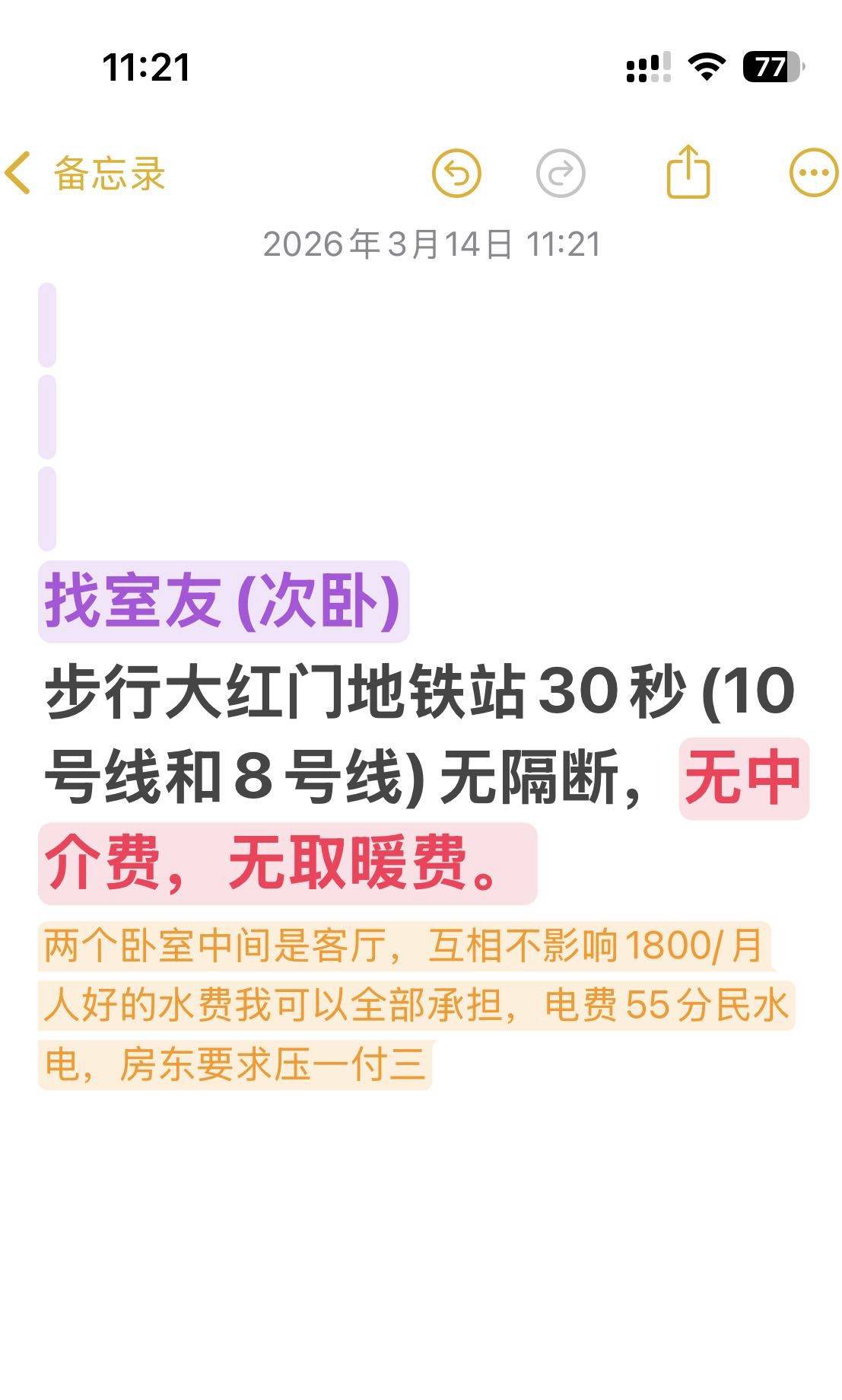 招合租,两室一厅中间有客厅,互相不影响,有燃气厨房,1800/月一付三,无中介费,无服务费,无取暖费,只需要交电费,水费我能全承担 下楼步行1分钟就到大红门地铁站(10号线和8号线)