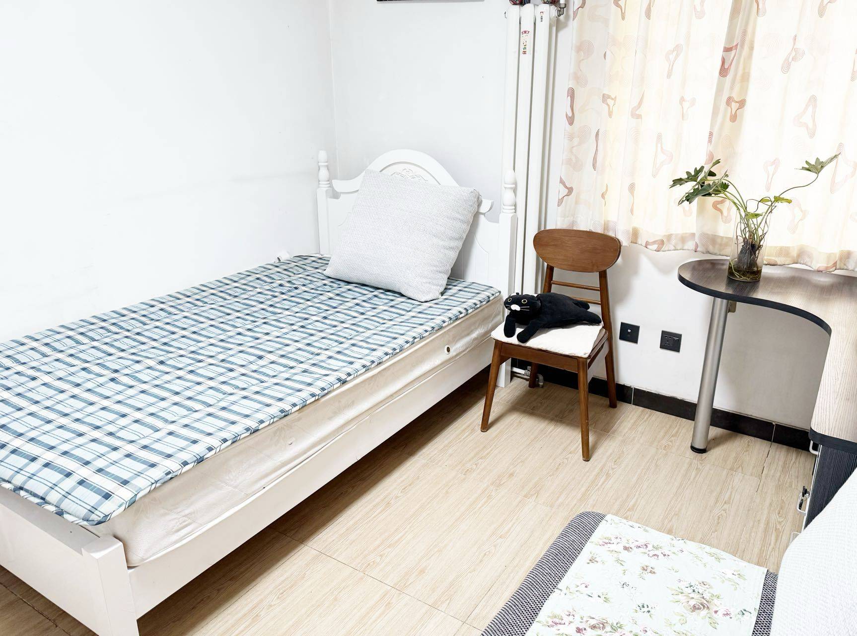 次卧情况:面向小区内部,安静明亮,视野开阔,通风优良,令人心情愉悦。配有1.2米实木单人床,弹簧床垫;小沙发、大衣柜和组合书桌。单独配有空调。