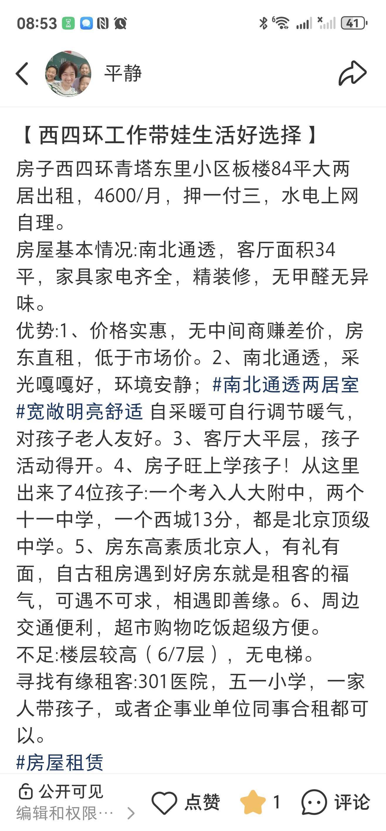 房东大学毕业留在这座城市,工作结婚生子交朋友,已有近四十个年头了,深知相遇即缘分,来者都是客,真心真意陪伴了四任租房家庭,他们有的孩子从这里出生成长,考到了人大附中,十一中学才离开,幼儿园,小学毕业6-7年的相处早已处成朋友亲戚。愿我和我的房子有缘结识到下一位租客,我们一起在这座城市里平静地生活工作过日子。