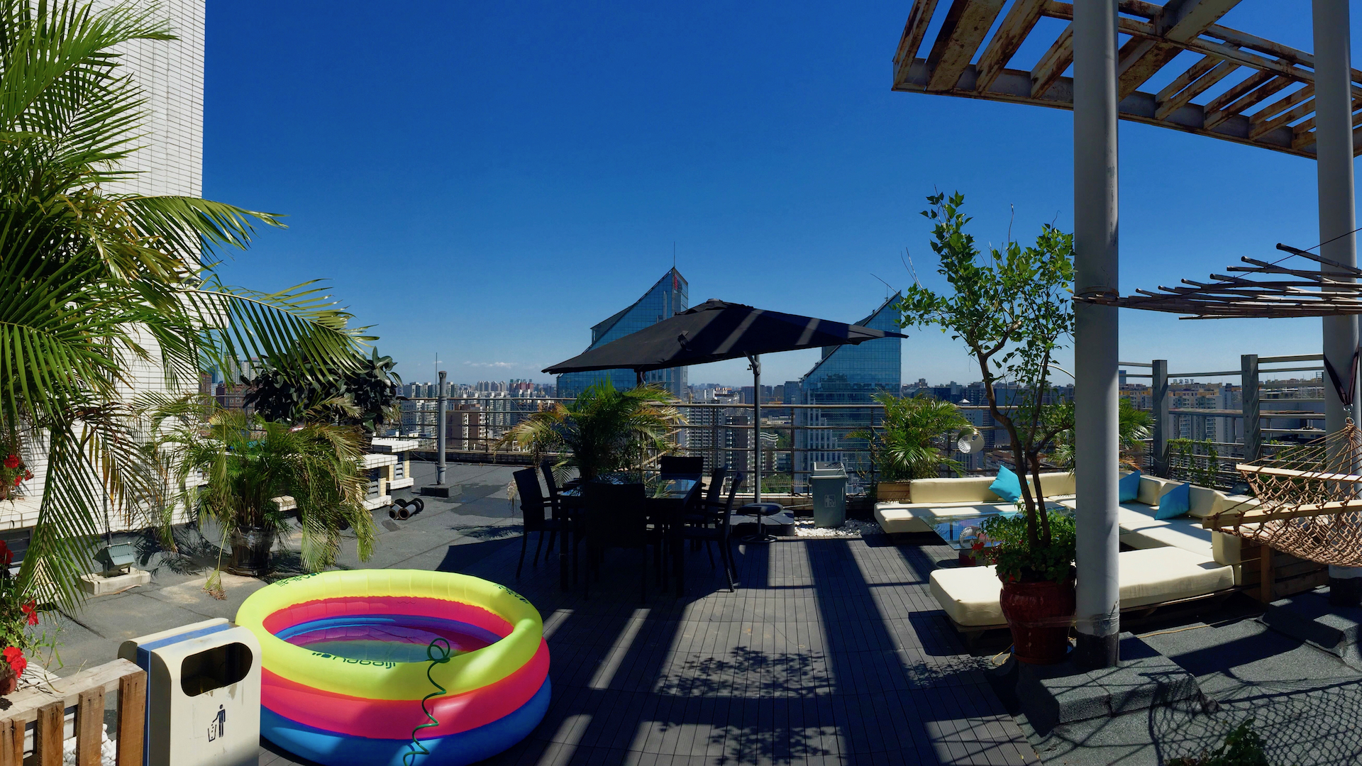 2 min walk from ShuangJing(双井) subway station on the top of R&F City lies a perfect zombie apocalypse safe house. 2 floors, 2 bedrooms, 3 bathrooms ,and a huge rooftop terrace with a CBD view to die for. The house has gone through multiple renovations and is constantly upgraded so it looks fresh and comfy. The apartment has all conceivable amenities, including: water/air filtration, smart home appliances, organic farm, BAR+BBQ, DJ set-up, VPN 200M internet, 5.1 cinema, PS4VR and more. The housekeeper is a Michelin star chef, no seriously, her food is outstanding. She comes 6 days a week and keeps the residence clean and tidy. (Her salary is not included) Ive lived in Beijing for more than 20 years, so trust me when I say, that this is the best spot in town. 距离双井地铁站步行2分钟,富力城顶楼,一个完美的僵尸末日到来都很安全的房子。 2层楼,2间卧室,3间浴室和一个巨大的屋顶露台可观看CBD景观。 房子经过了多次装修,不断升级,看起来清新而舒适。公寓有所有可想到的设施,包括:水/空气过滤,智能家电,有机农场,吧台和烧烤区,DJ设置,VPN200M互联网,5.1电影院,PS4VR等。 管家是米其林星级厨师,说真的,她的食物很出色。她每周过来六天,保持住宅的整洁。 我在北京住了二十多年,所以相信我,这是最好的位置。