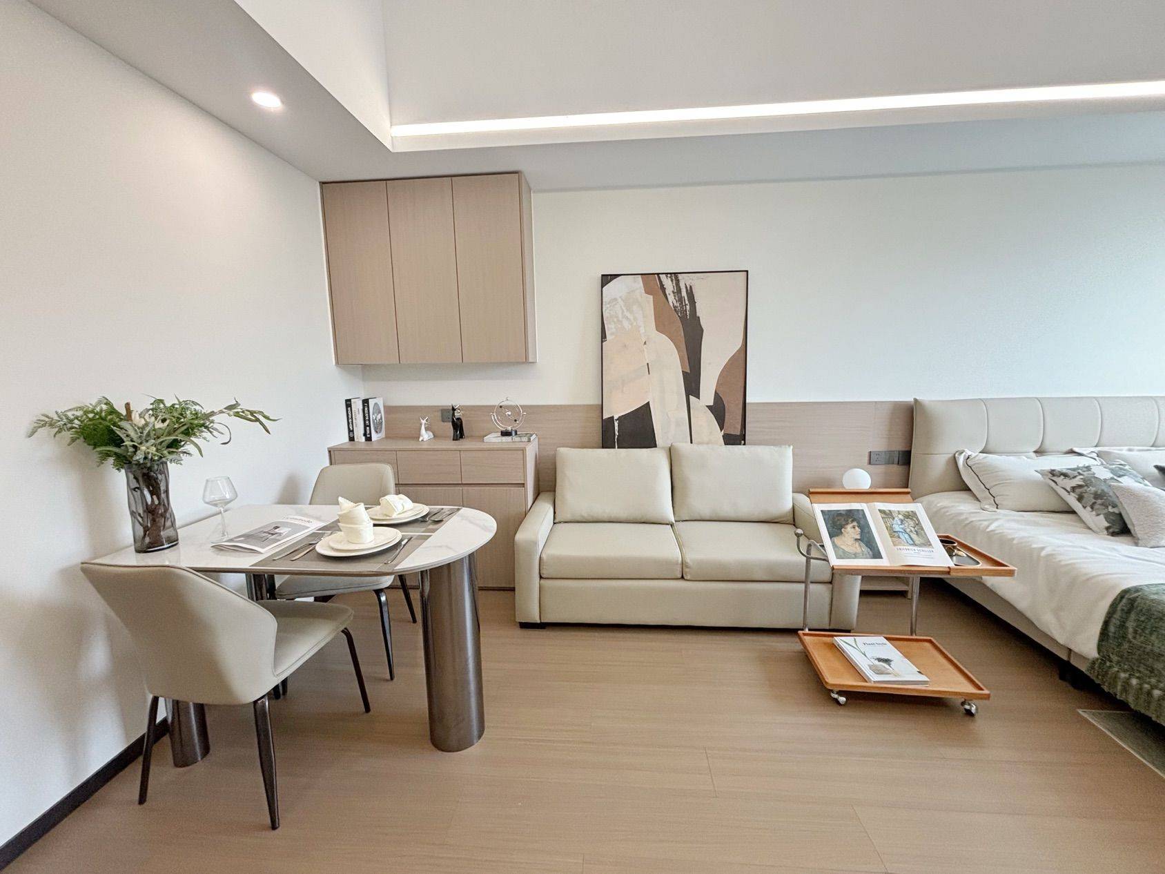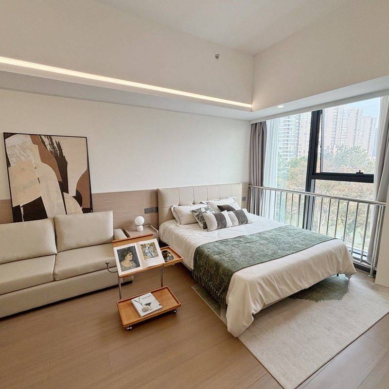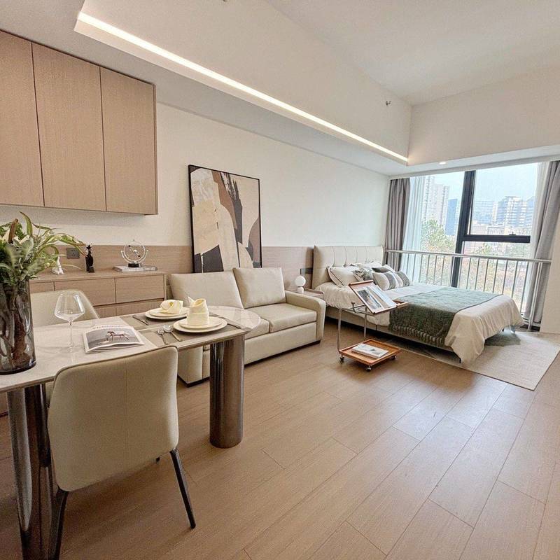 直租无中介,可直接签约!房子是精装一室户(套内功能区齐全,等同一室一厅使用),现代轻奢风格装修,全屋品牌定制柜体,收纳空间拉满。 客厅摆放浅色系真皮沙发,氛围感十足;卧室区域空间宽敞,大床+观景落地窗,采光视野绝佳,俯瞰城市景观超惬意。厨卫配套齐全,家电均为全新品牌款(冰箱、空调、洗衣机等),拎包就能入住。 小区是高端物业,24小时安保,楼下有商业配套和休闲区,步行可达地铁口,通勤出行超方便。希望找爱干净、有稳定工作、作息规律的租客,民水民电费用透明,房屋有任何问题都会及时处理。看房提前预约,非诚勿扰~